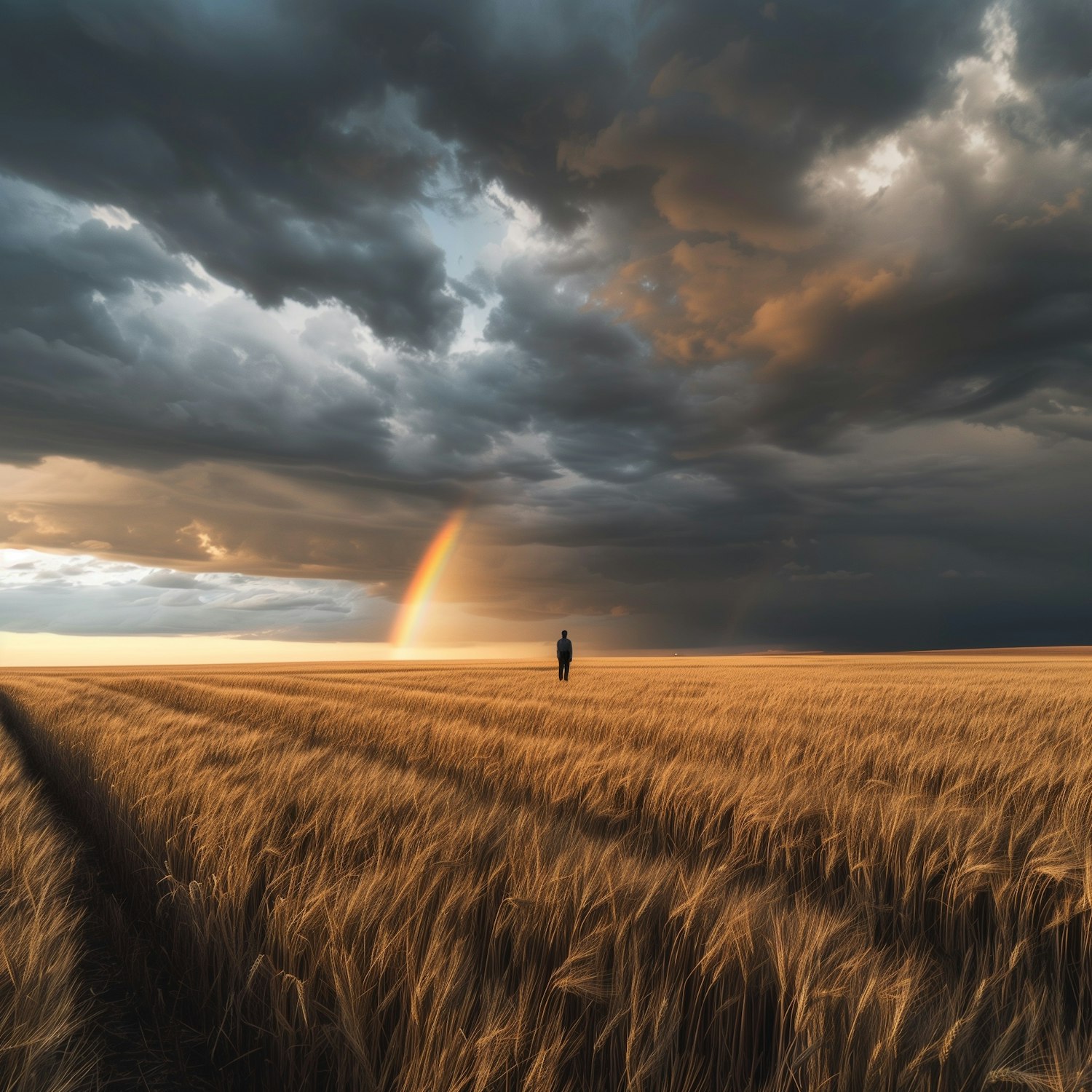 A lone figure stands in a golden wheat field under a dramatic sky with a rainbow, creating a serene and contemplative scene.