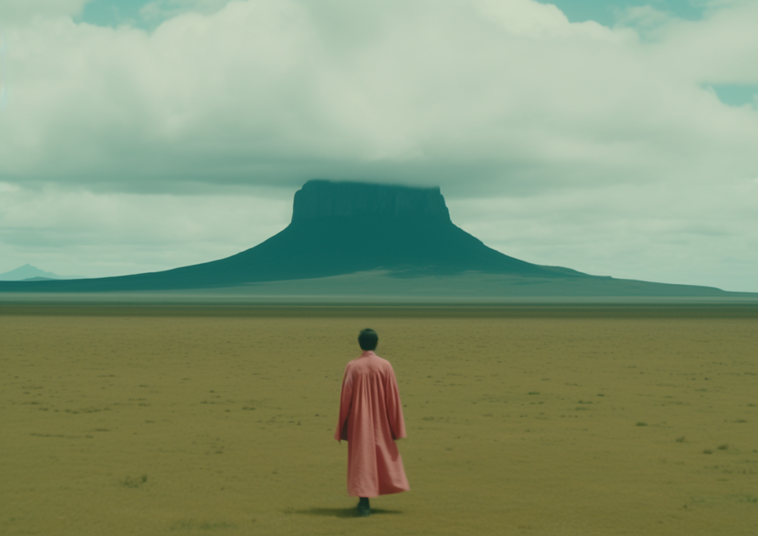 A lone figure in a pink coat stands in a vast landscape, facing a distant flat-topped mountain under a cloudy sky.
