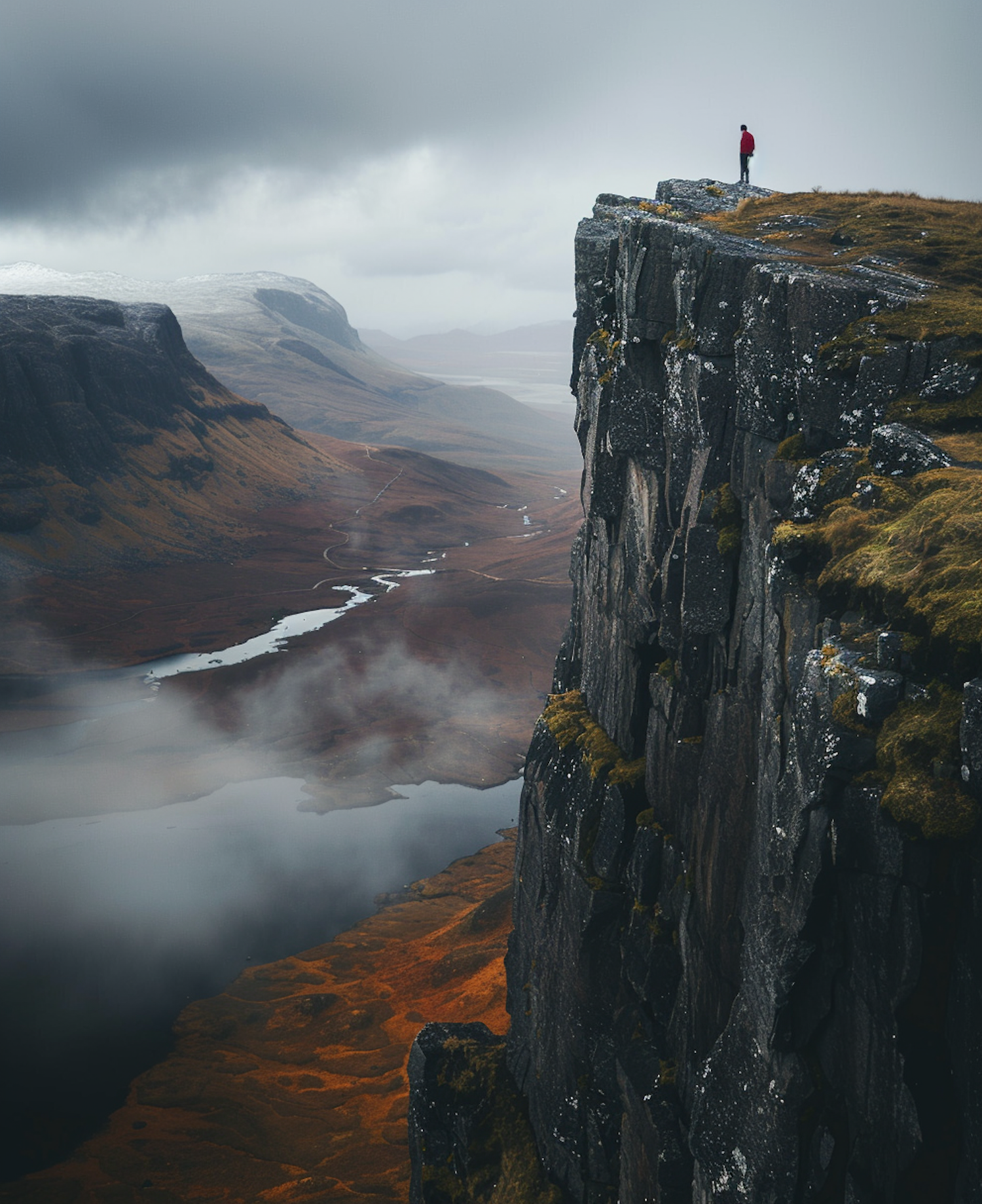 A person in a red jacket stands on a cliff edge, overlooking a vast, misty valley with mountains and a winding river under a cloudy sky.
