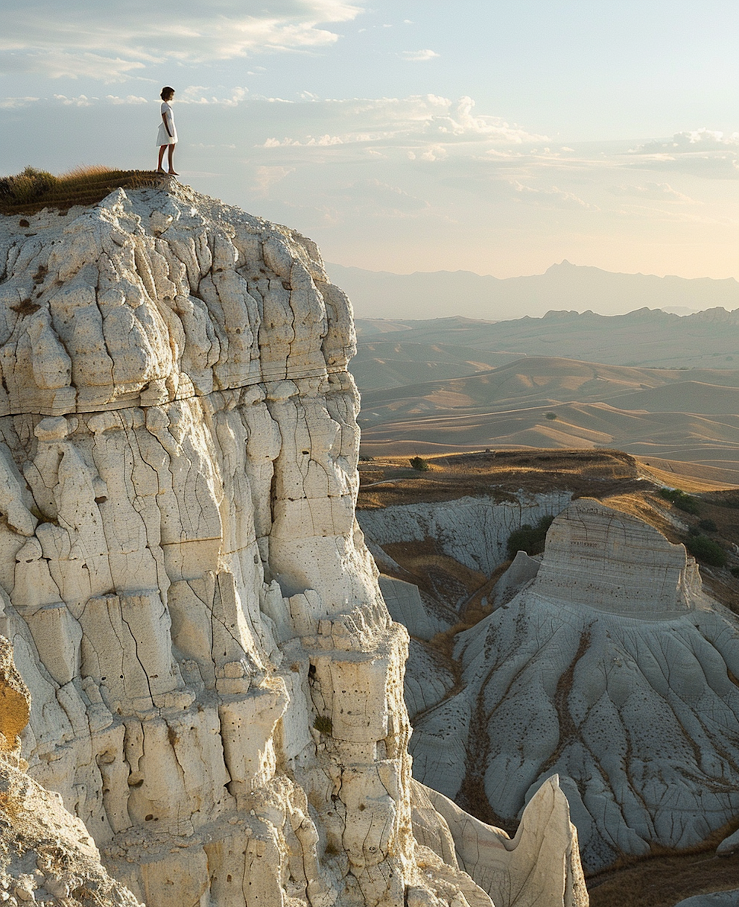 Person in white stands atop a rugged white cliff, overlooking vast golden hills under a serene, partly cloudy sky.