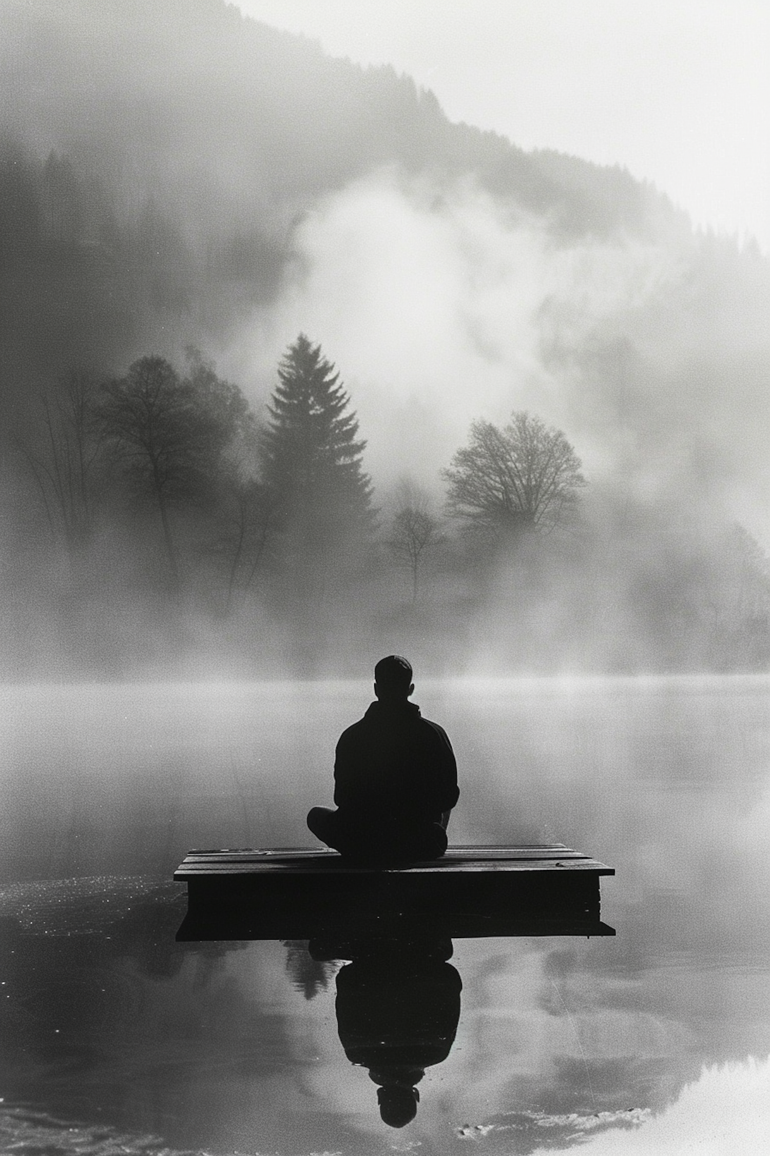 Silhouette of a person meditating on a misty lake, creating a serene and contemplative atmosphere.