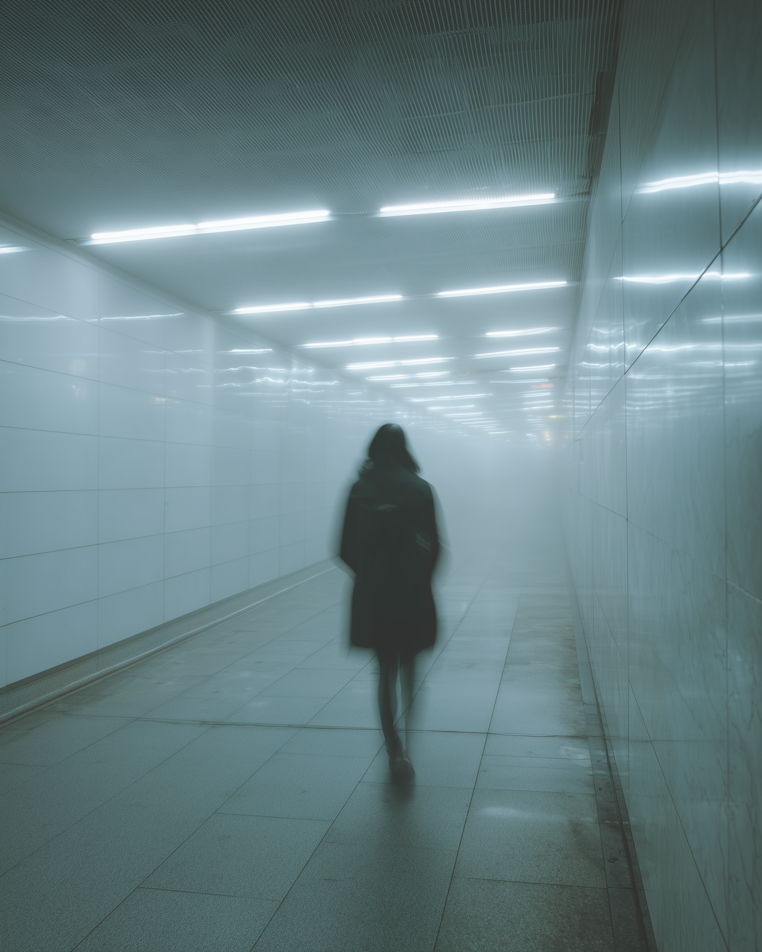 Blurred figure walking through illuminated, foggy corridor with white tiled walls and cool blue lighting, creating a mysterious atmosphere.