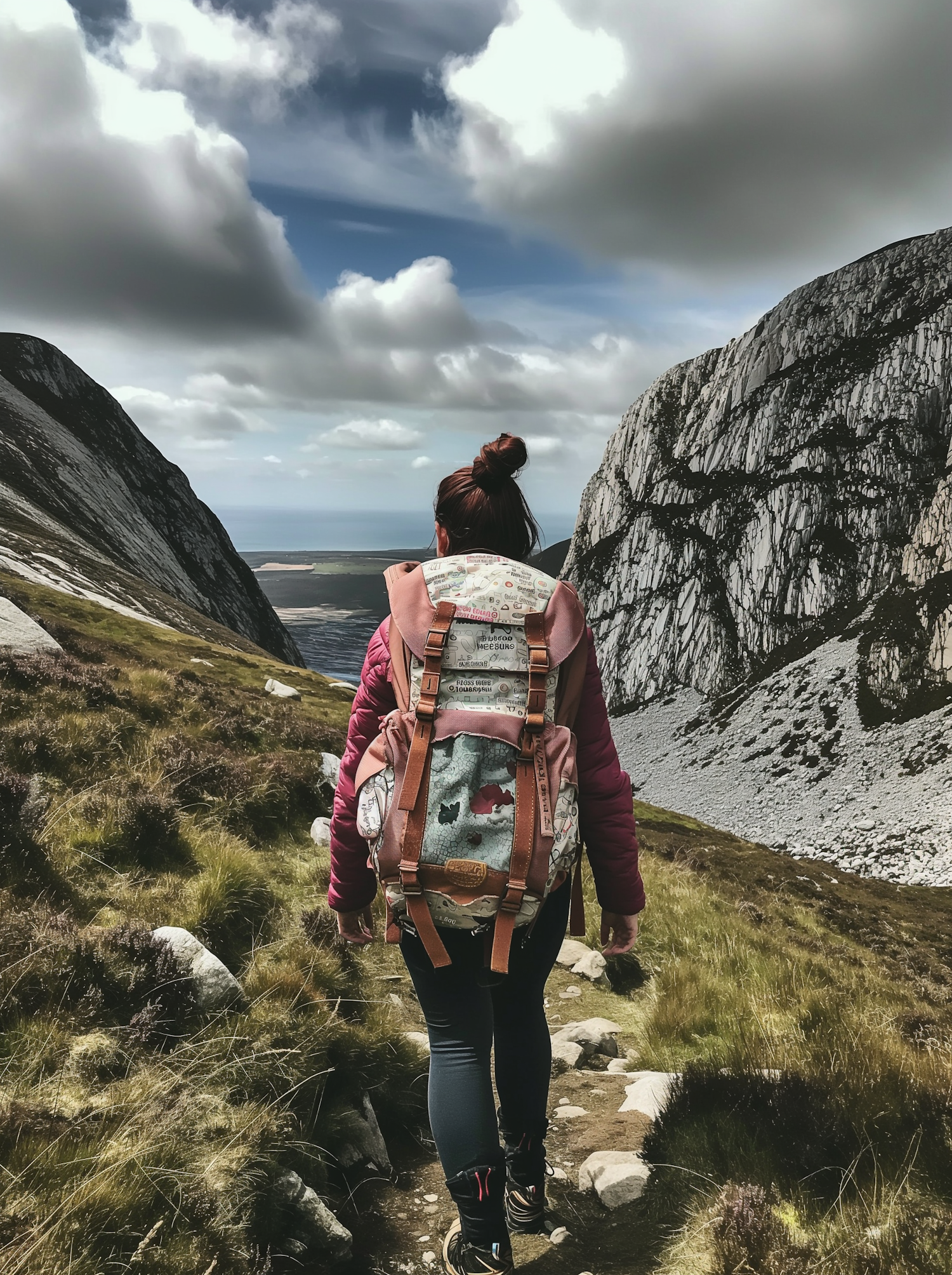 Woman hiking through a scenic mountain pass with a colorful backpack, surrounded by cliffs and dramatic clouds.
