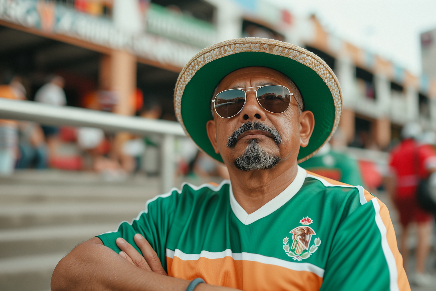 Confident man in a green sports jersey and straw hat at a stadium, exuding a composed presence with aviator sunglasses and a goatee.