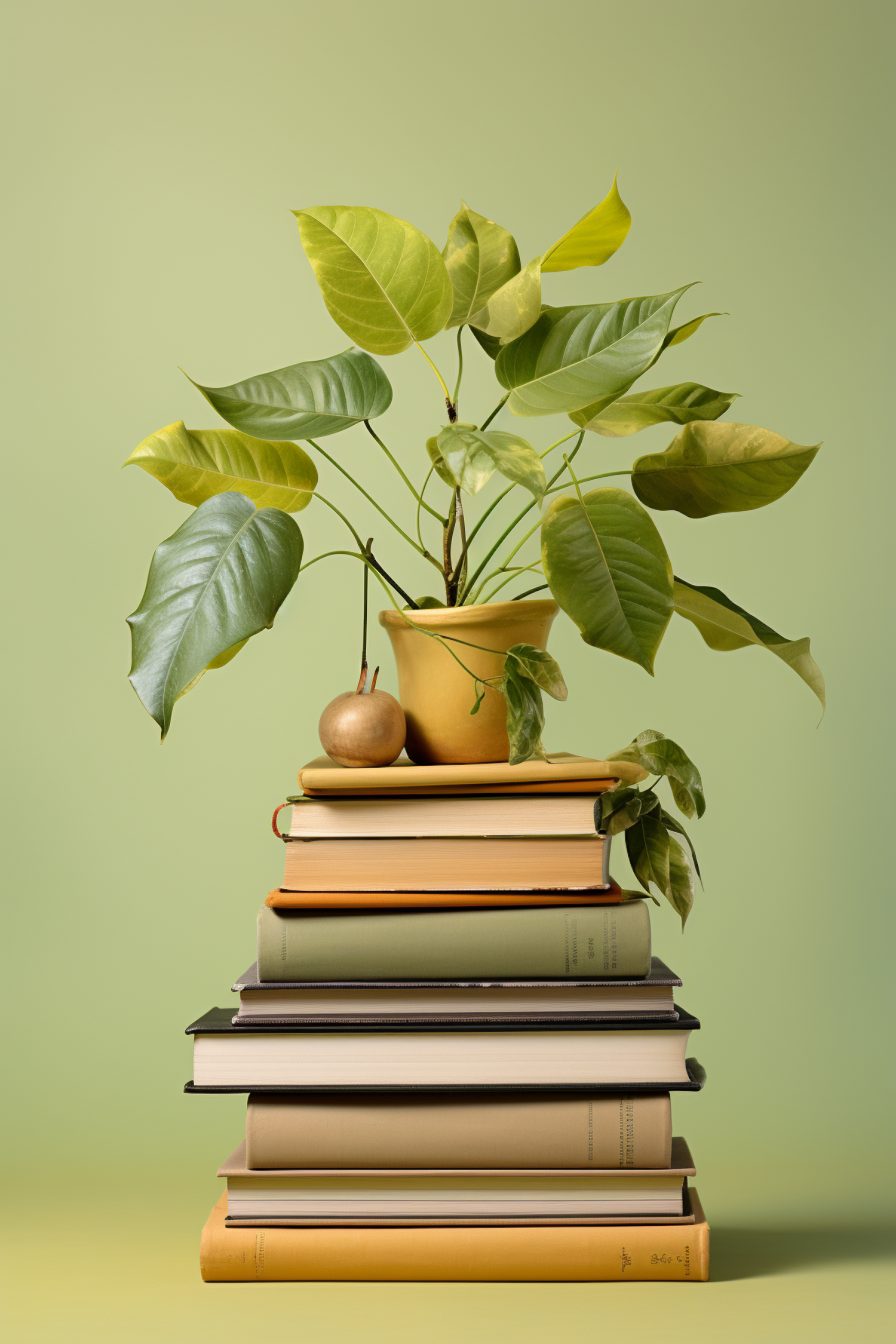 A stack of books topped with a leafy plant and a golden ornament against a soft green background.