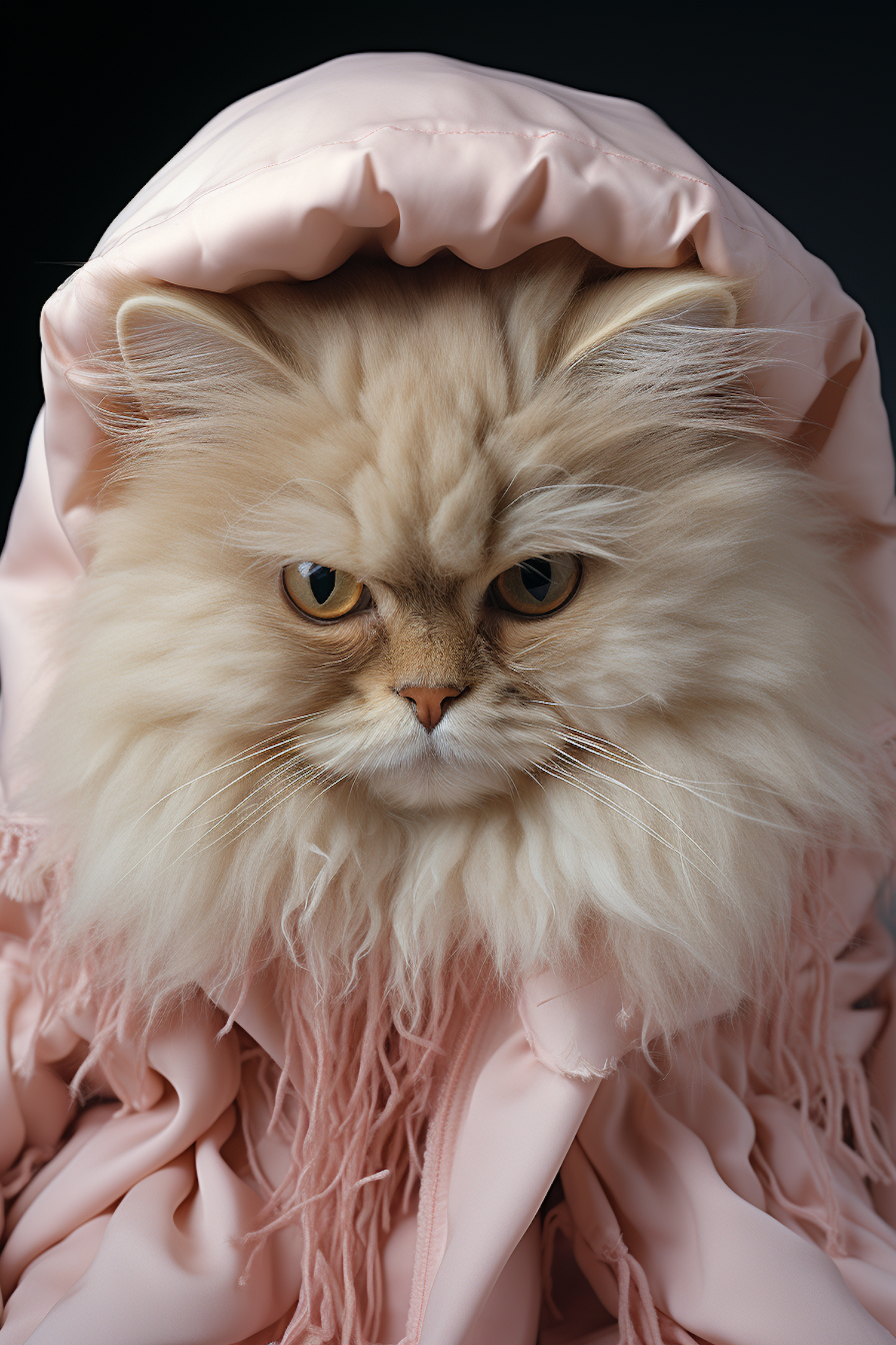 Fluffy Persian cat wrapped in pink fabric, showcasing its golden eyes and luxurious fur against a dark background.