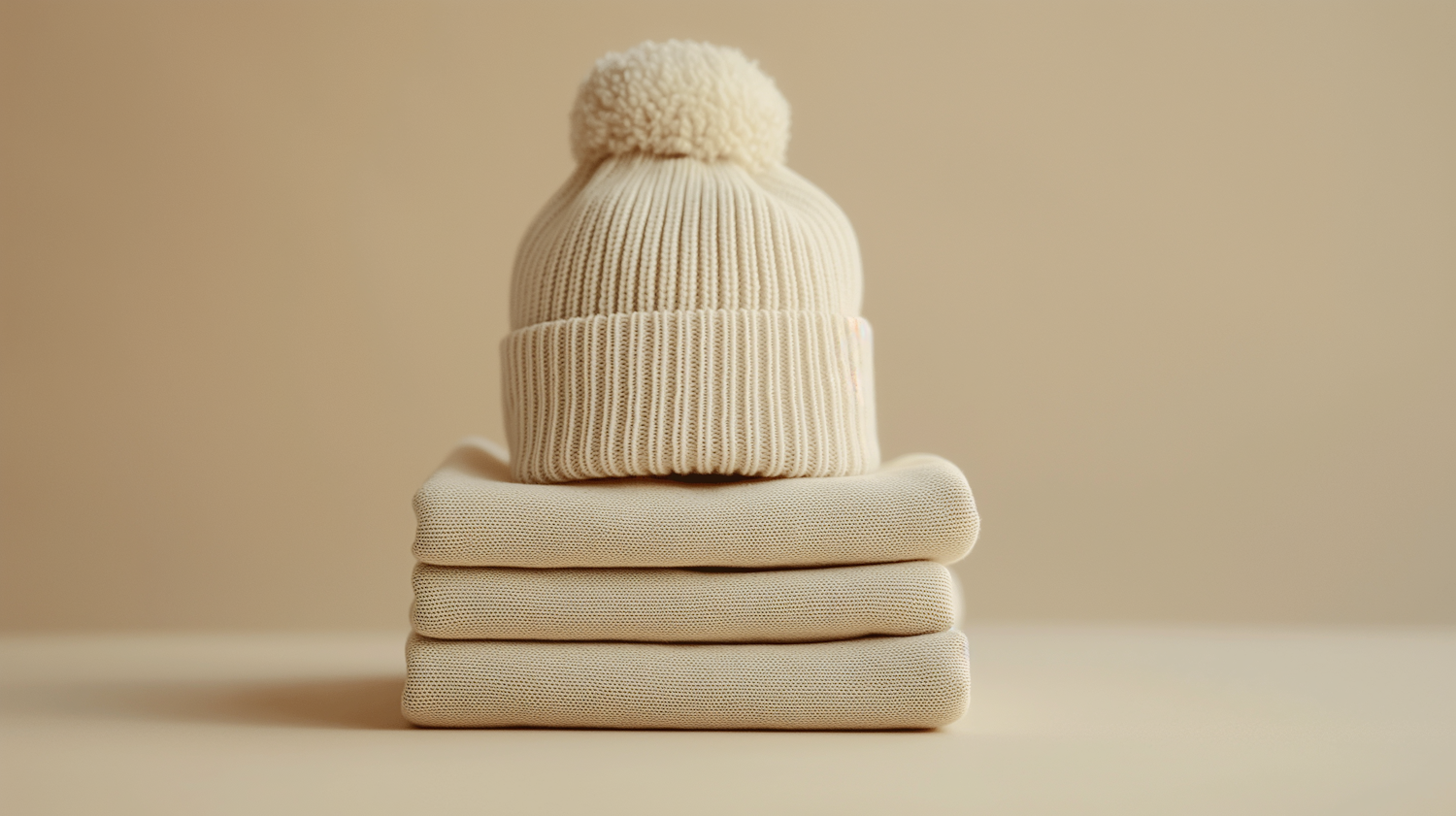Stacked beige sweaters topped with a matching knit beanie, set against a warm beige background for a minimalist aesthetic.