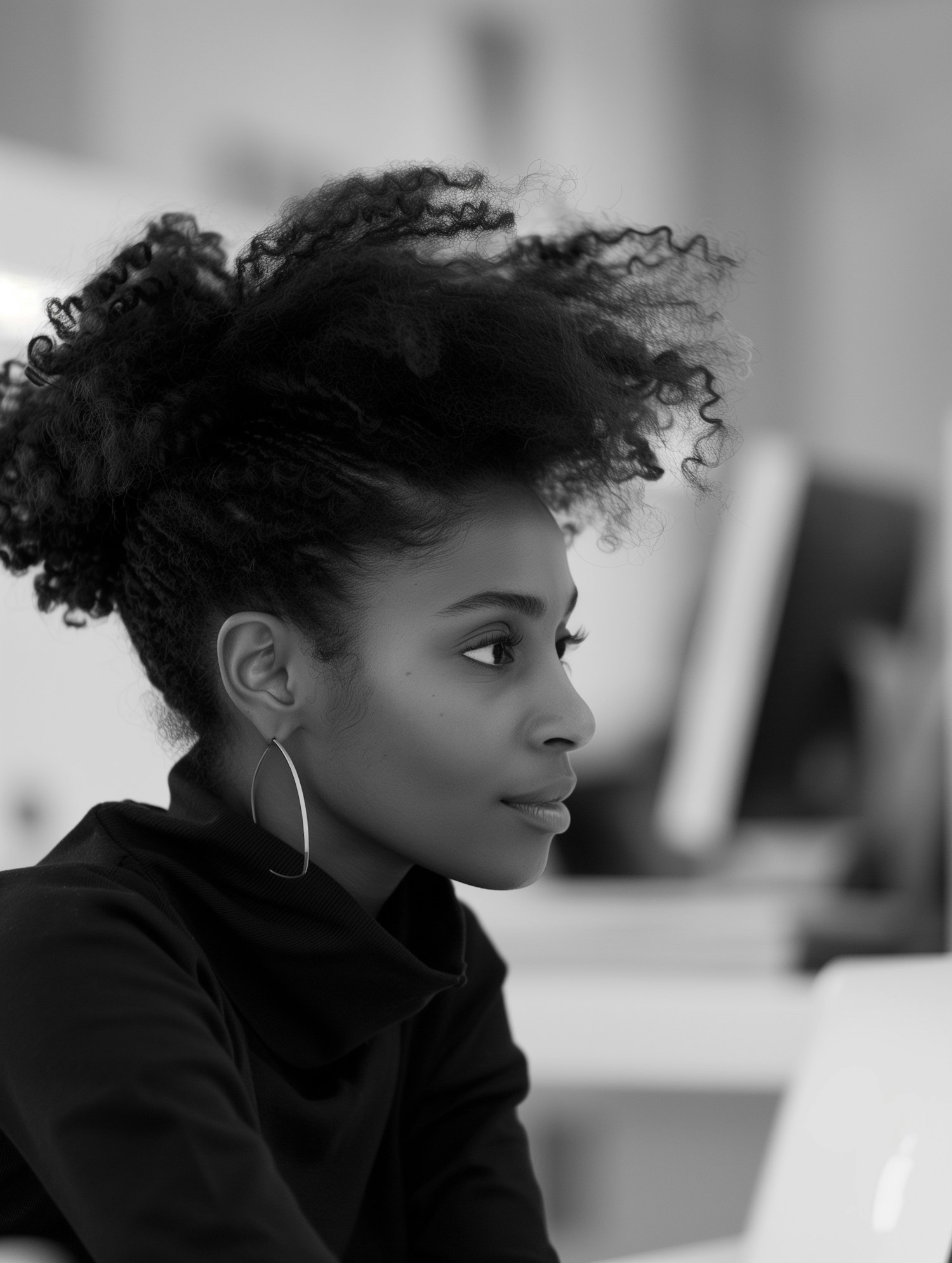 Monochrome portrait of a woman with curly hair and hoop earrings, focused in an office setting.