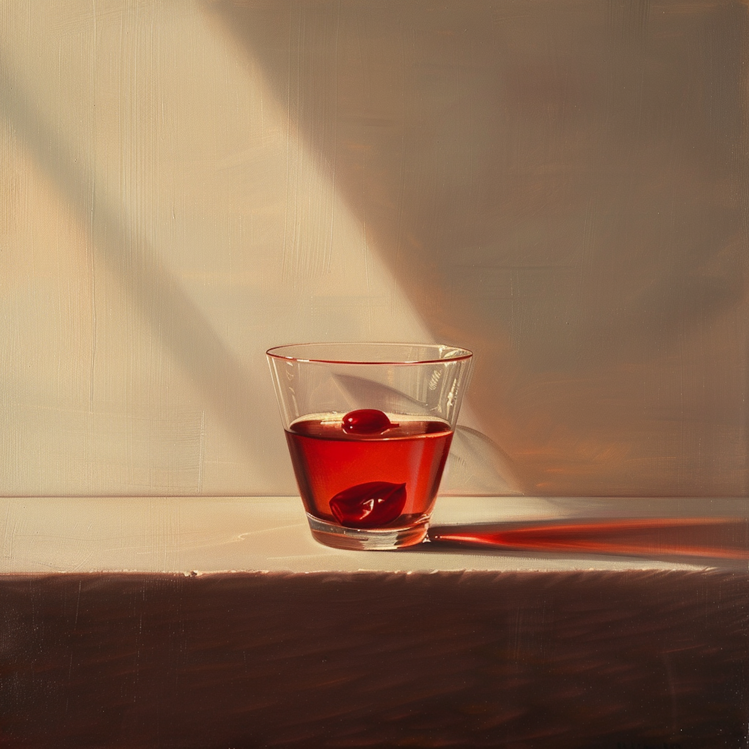 Elegant glass with reddish-brown cocktail and cherry, casting a long shadow on a white surface. Warm, serene lighting enhances the scene.