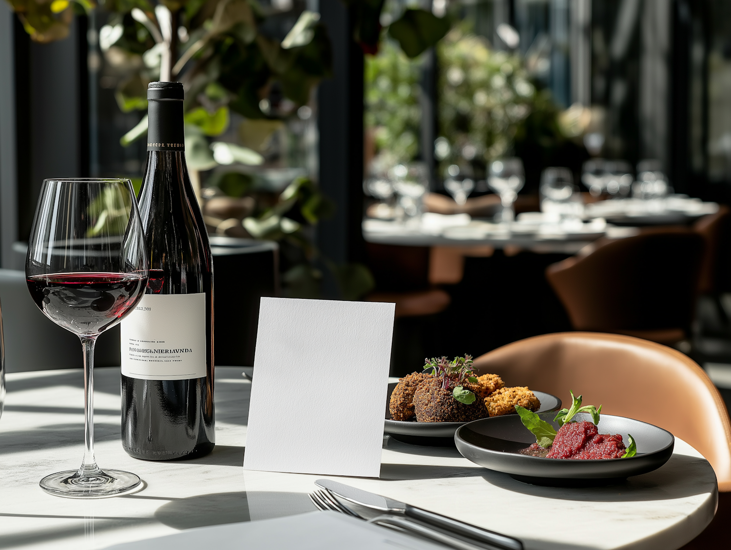 Elegant dining setup with red wine, gourmet dishes, and a modern restaurant ambiance.