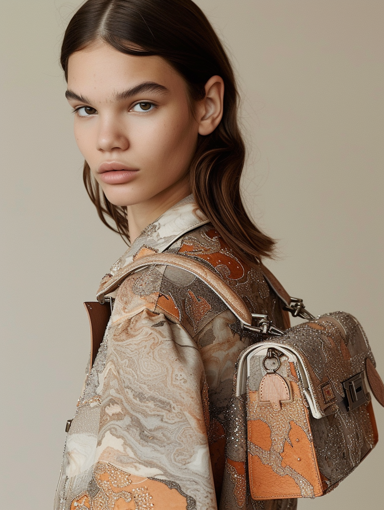Young woman with brown hair and patterned outfit, carrying a matching handbag. Neutral background enhances the earthy tones.