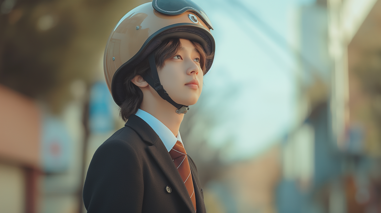 Young man in a suit and helmet gazes thoughtfully upwards, set against a blurred urban background.