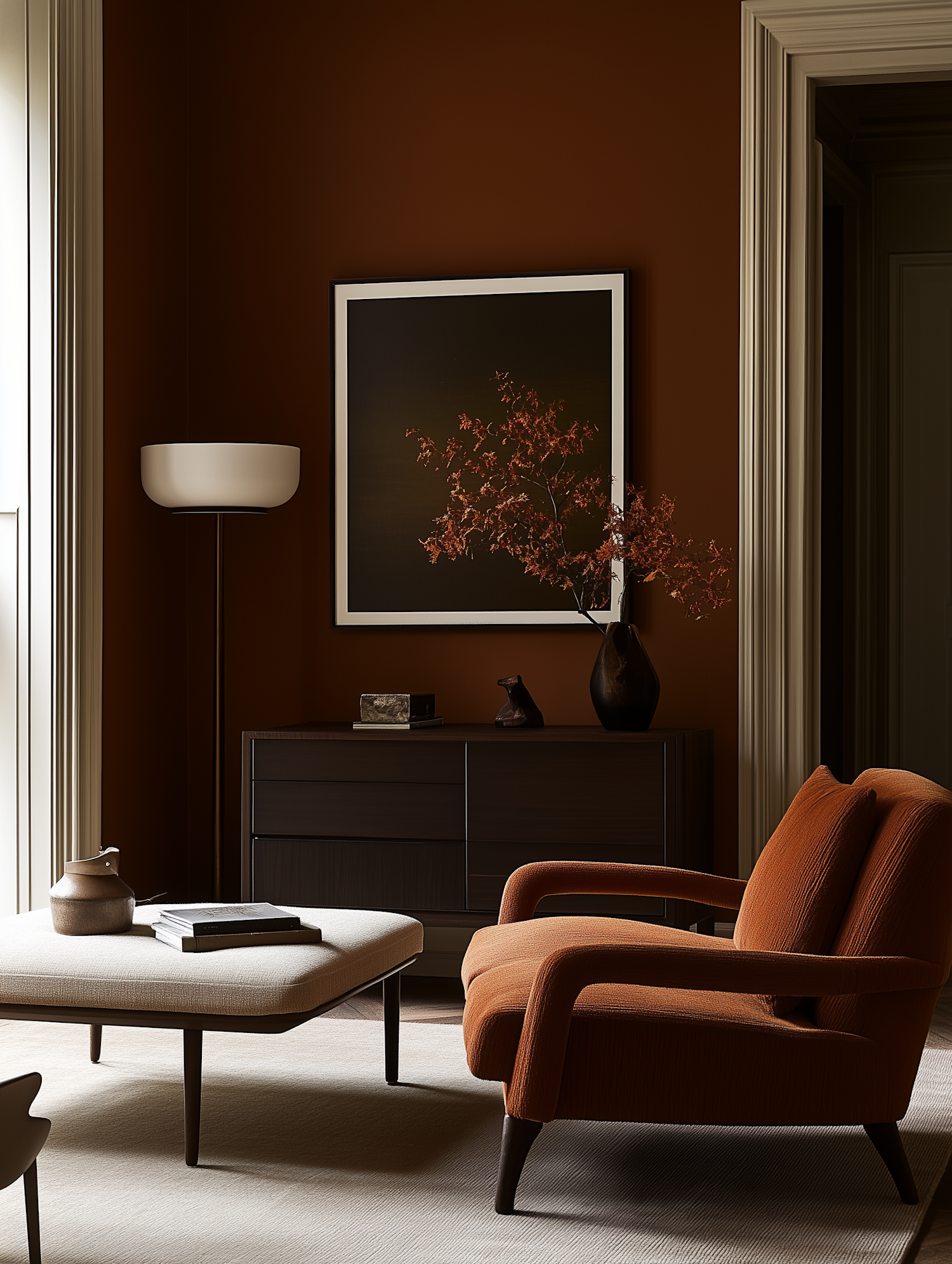 Warm living room with brown walls, orange armchair, and modern decor. Features a cozy ambiance with natural light and minimalist design.