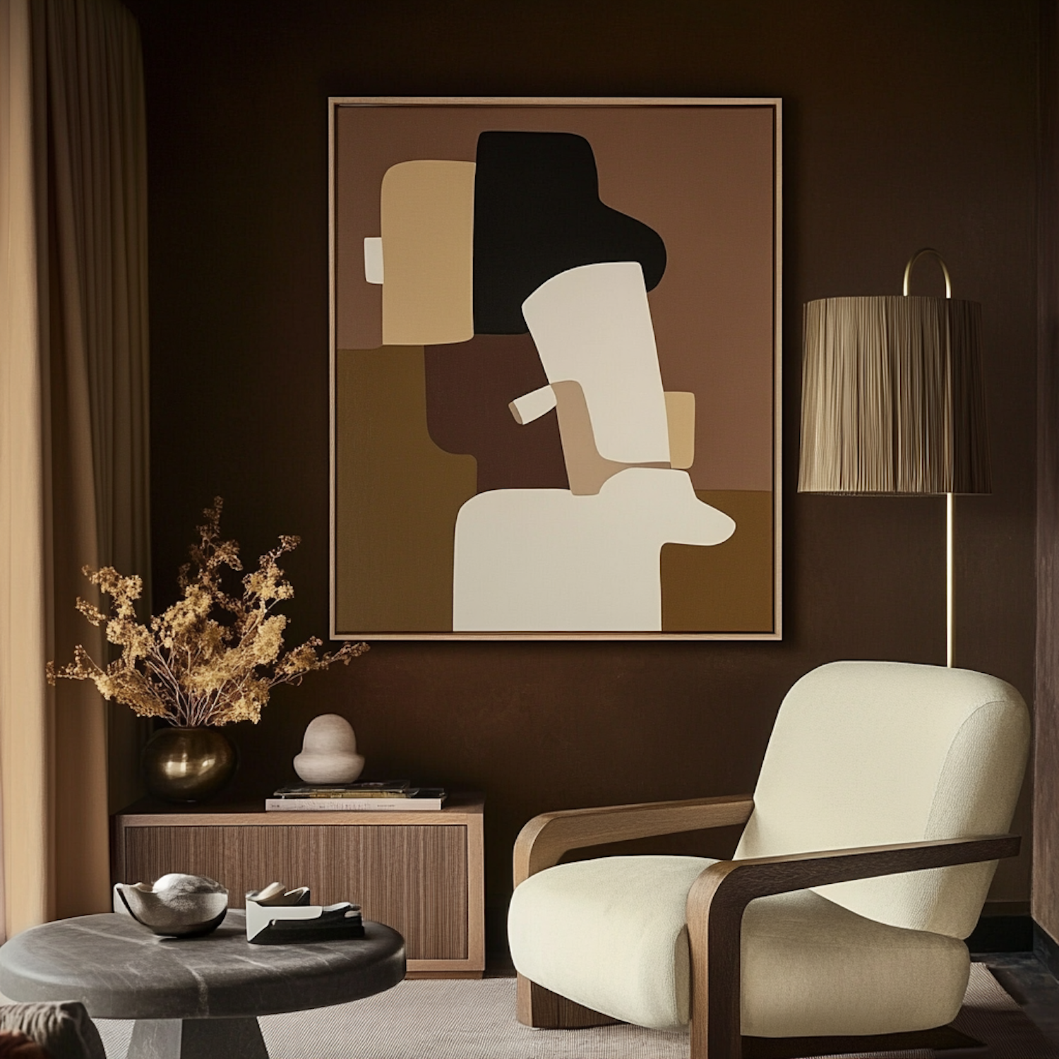 Elegant modern interior with abstract art, cream armchair, and warm lighting. Earthy tones create a sophisticated ambiance.
