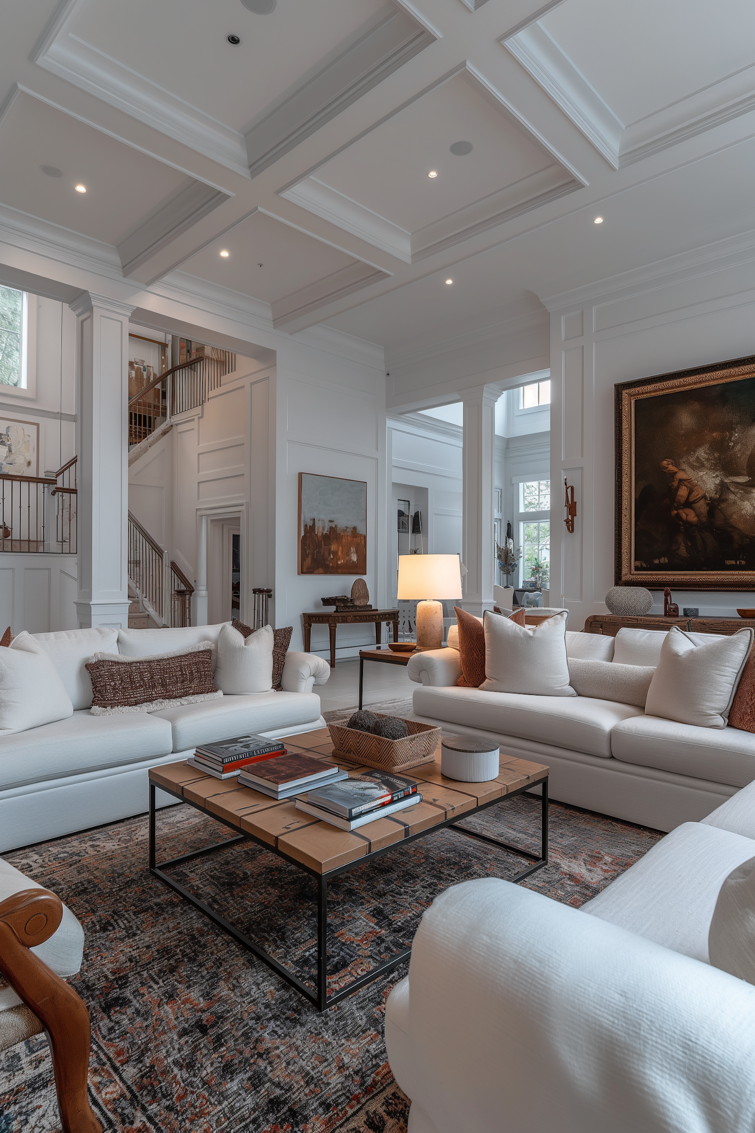 Luxurious living room with white sofas, elegant decor, and a grand staircase. High ceilings and classic art create a sophisticated ambiance.