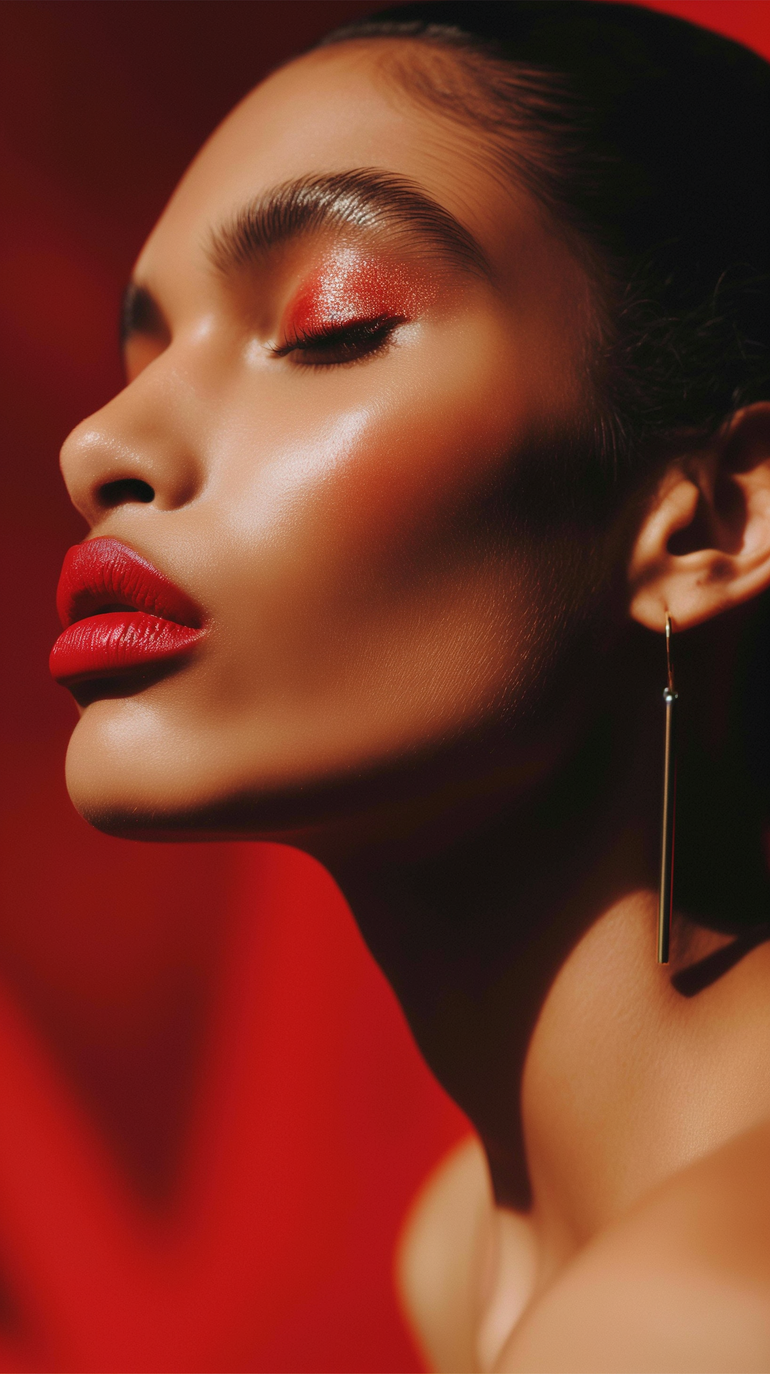 Close-up of a woman with bold red makeup and gold earring against a rich red background, highlighting elegance and style.