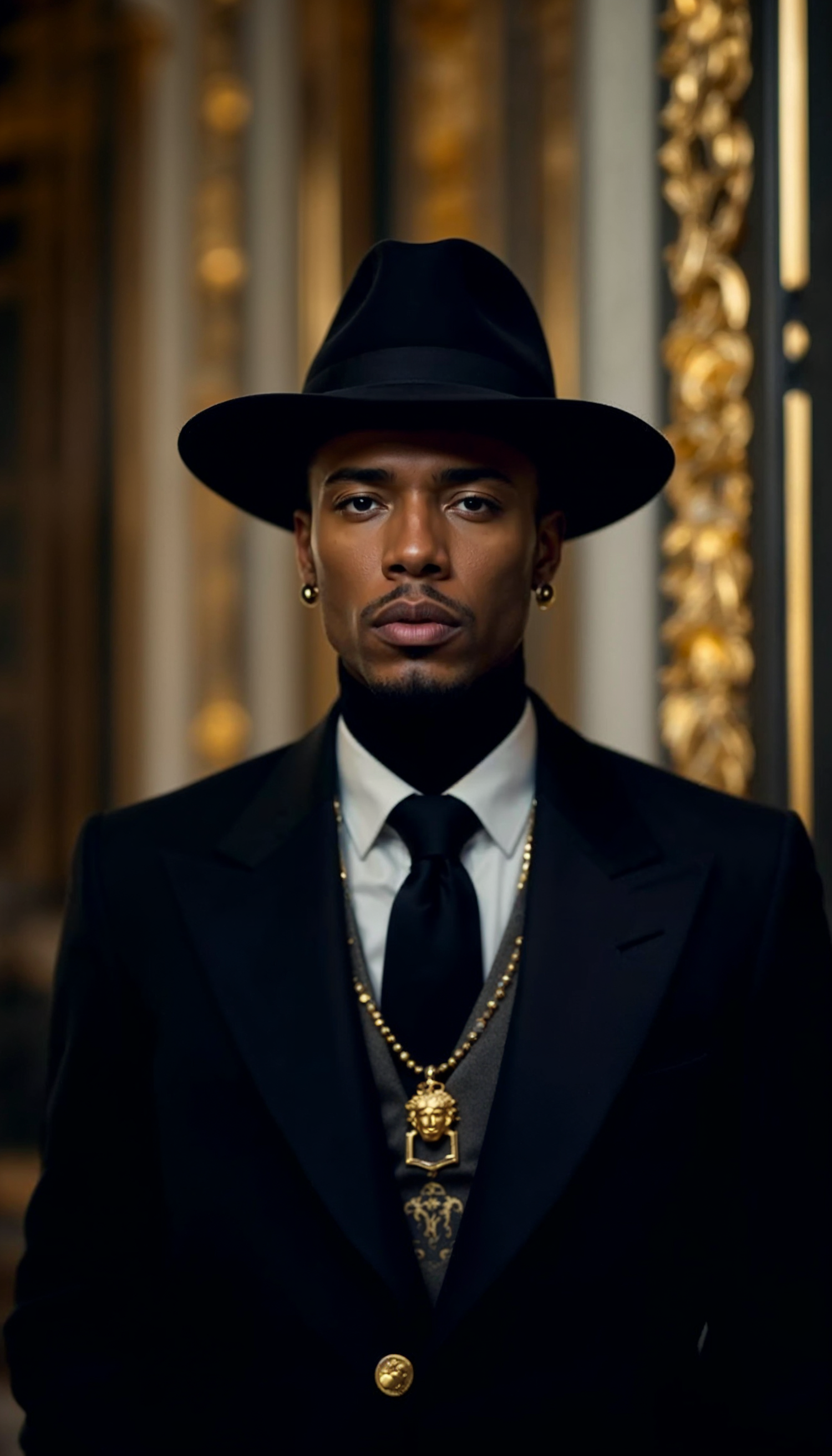 Stylish man in a black suit and fedora, adorned with gold jewelry, stands in an ornate setting, exuding elegance and confidence.