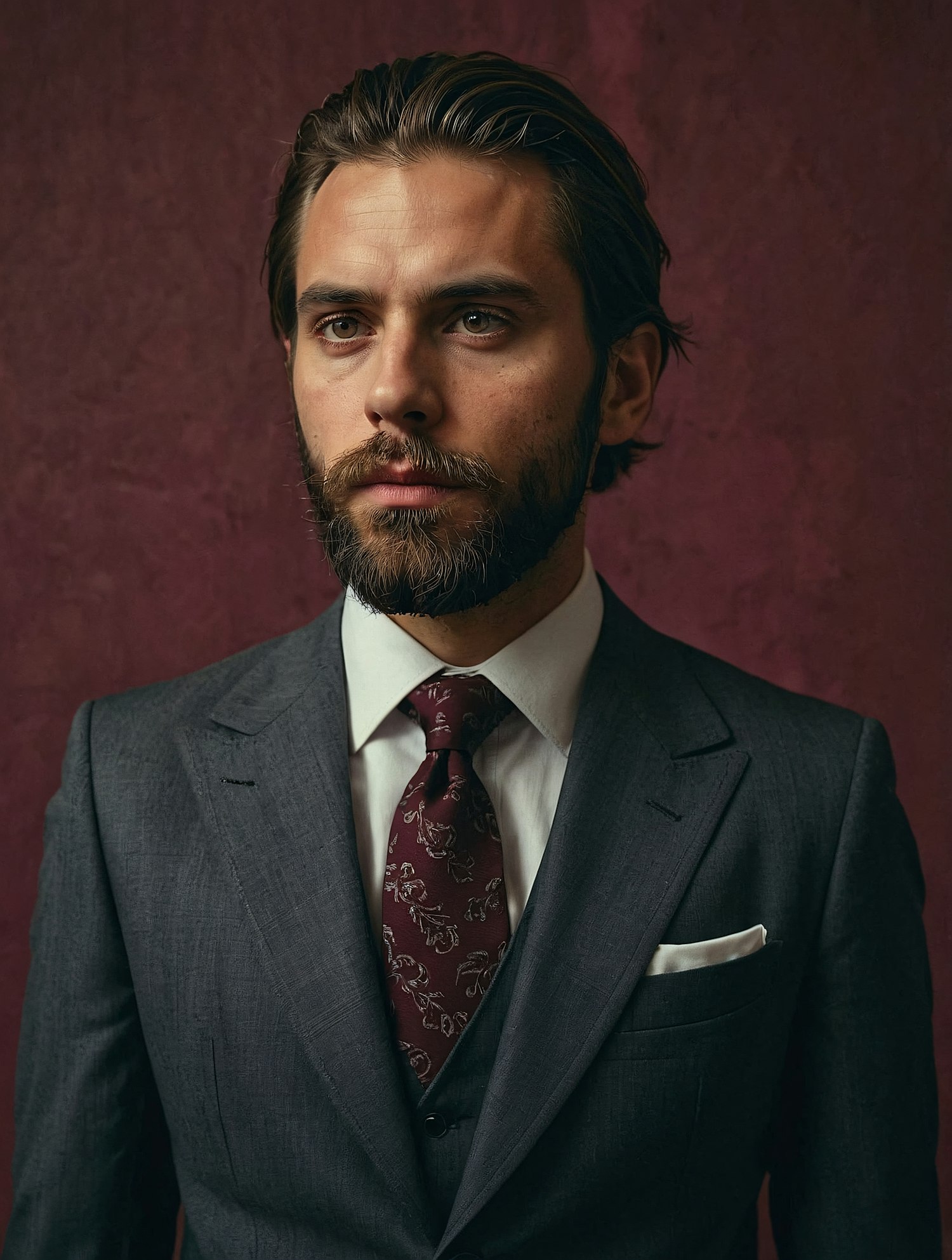 Caucasian man in a gray suit with a burgundy tie, standing against a maroon background. He has brown hair and a beard, looking serious.