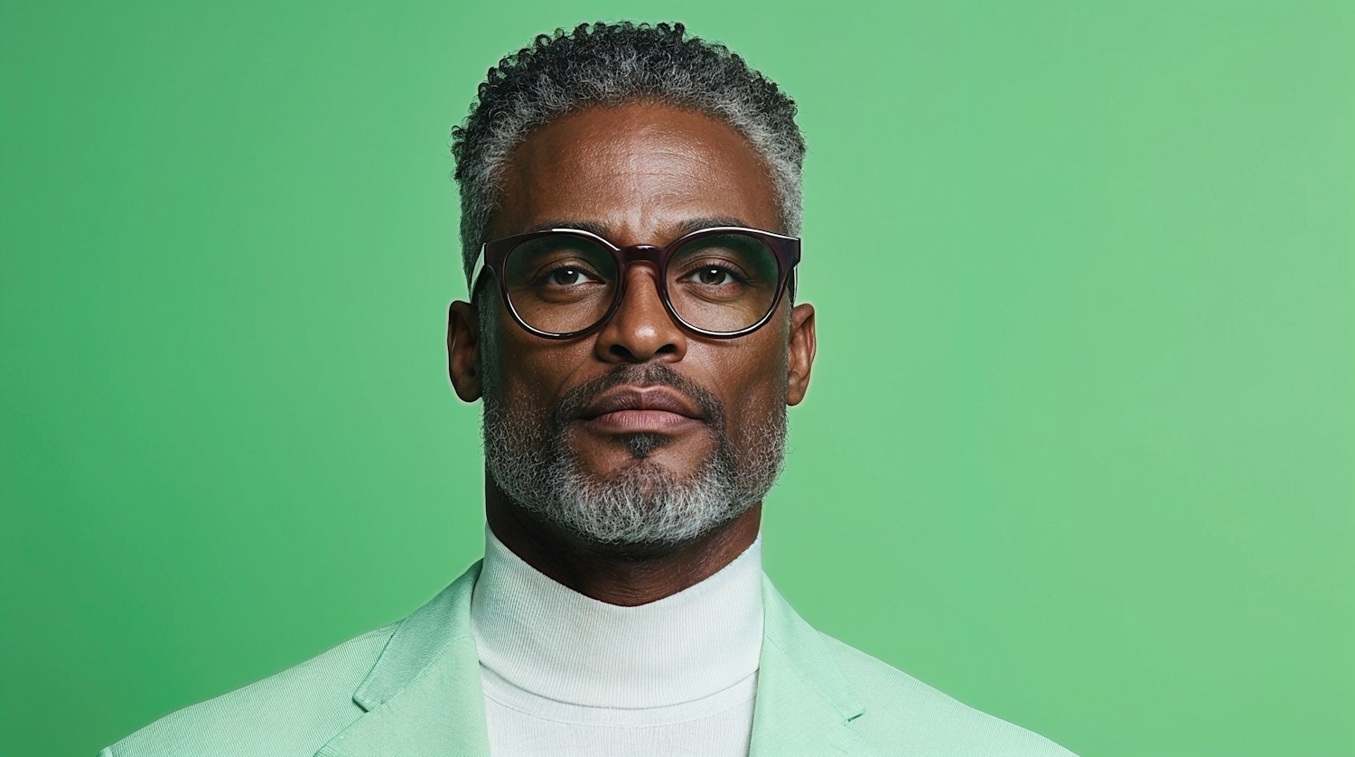 Stylish middle-aged man with gray hair and beard, wearing glasses and a green suit against a green background.