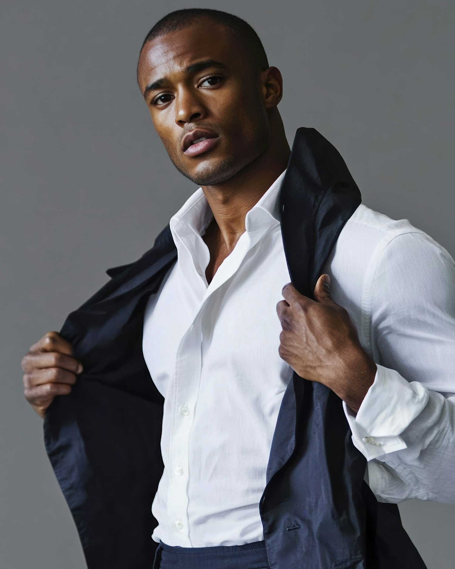 Confident Black man in a white shirt and dark jacket, exuding style and poise against a neutral gray background.