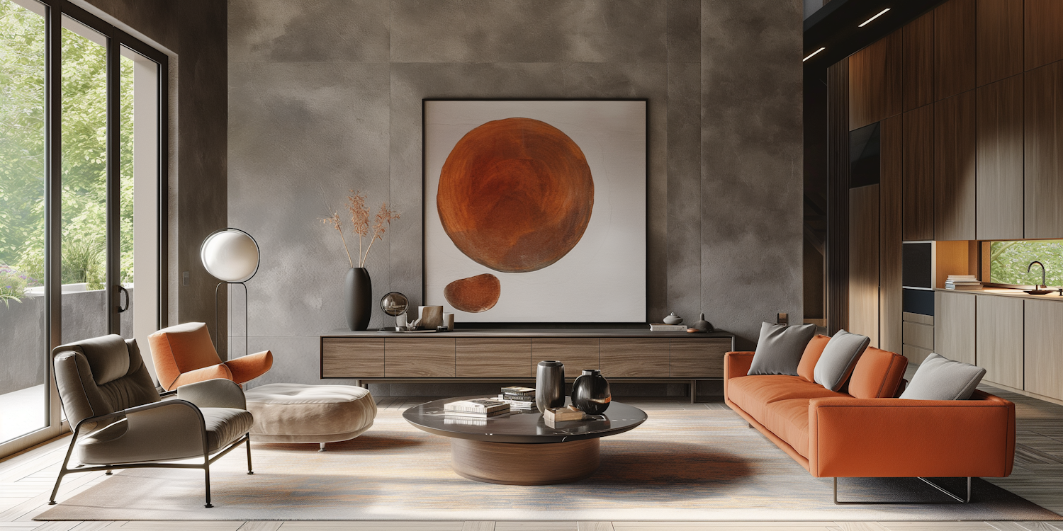 Modern living room with orange sofa, abstract art, and natural light. Features sleek furniture and integrated kitchen design.