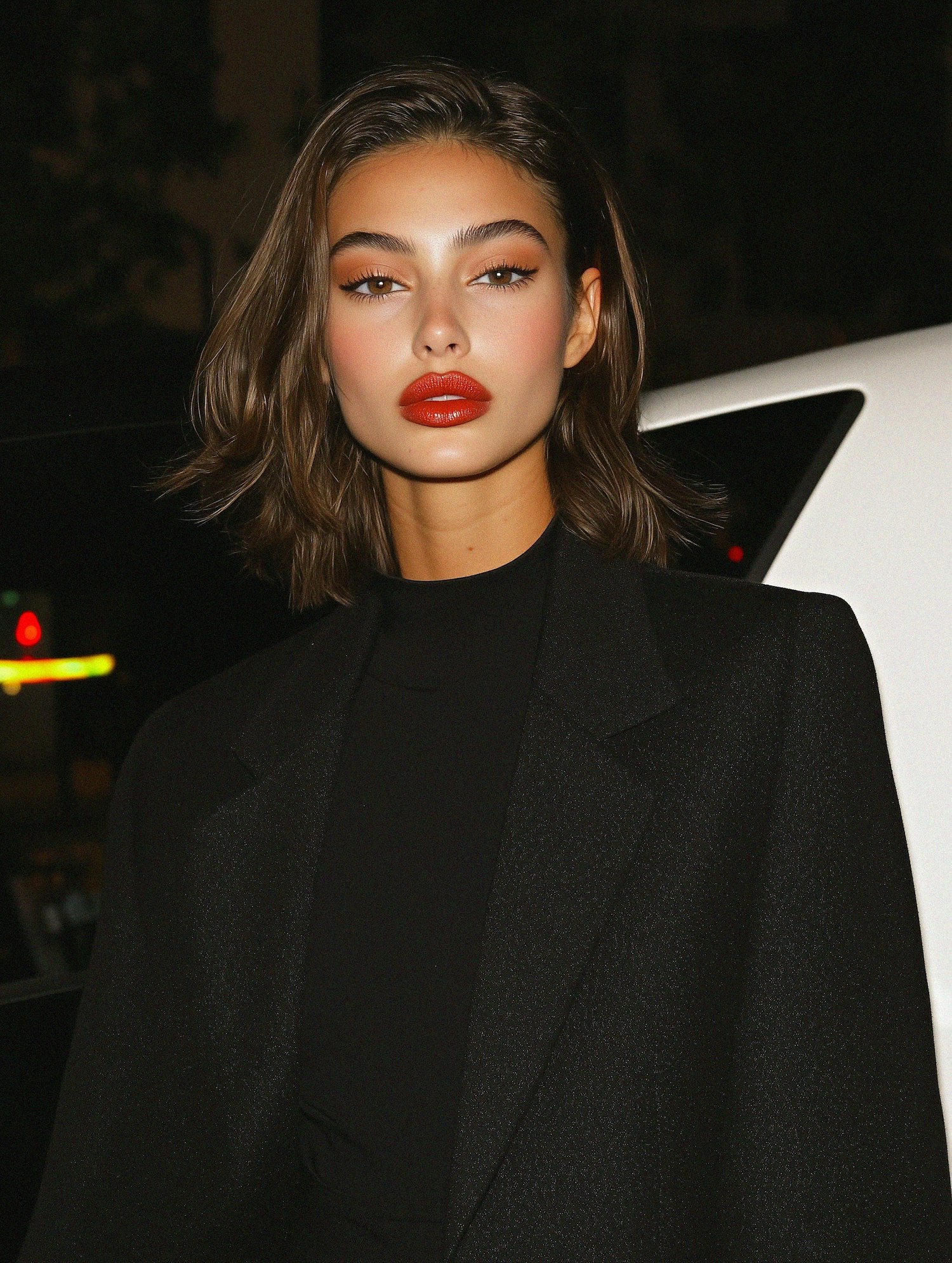 Stylish individual in black turtleneck and coat with blurred face, highlighting anonymity and elegance in a nighttime setting.