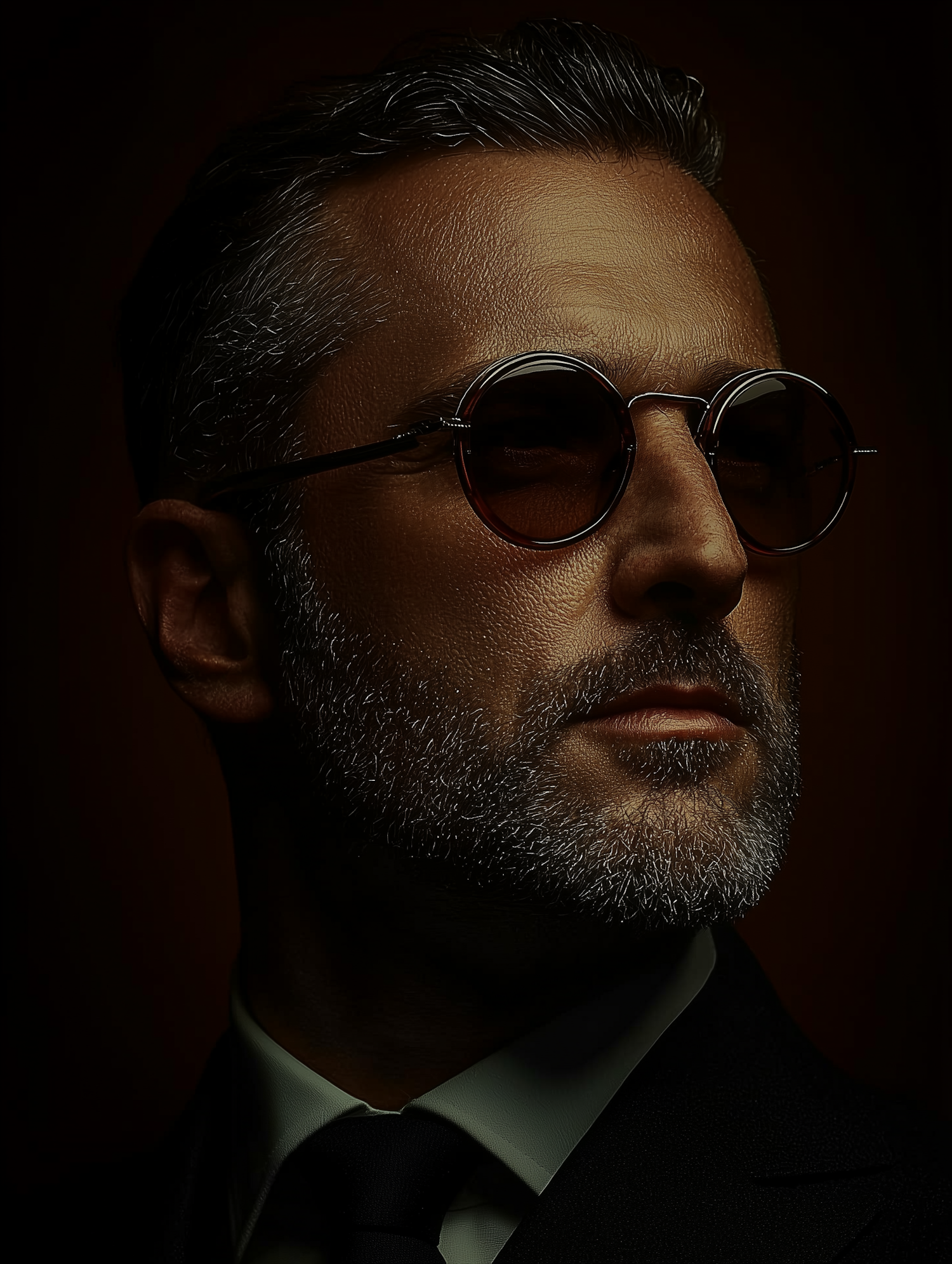 Portrait of a man in sunglasses and a suit, with a salt-and-pepper beard and dramatic lighting emphasizing his features.
