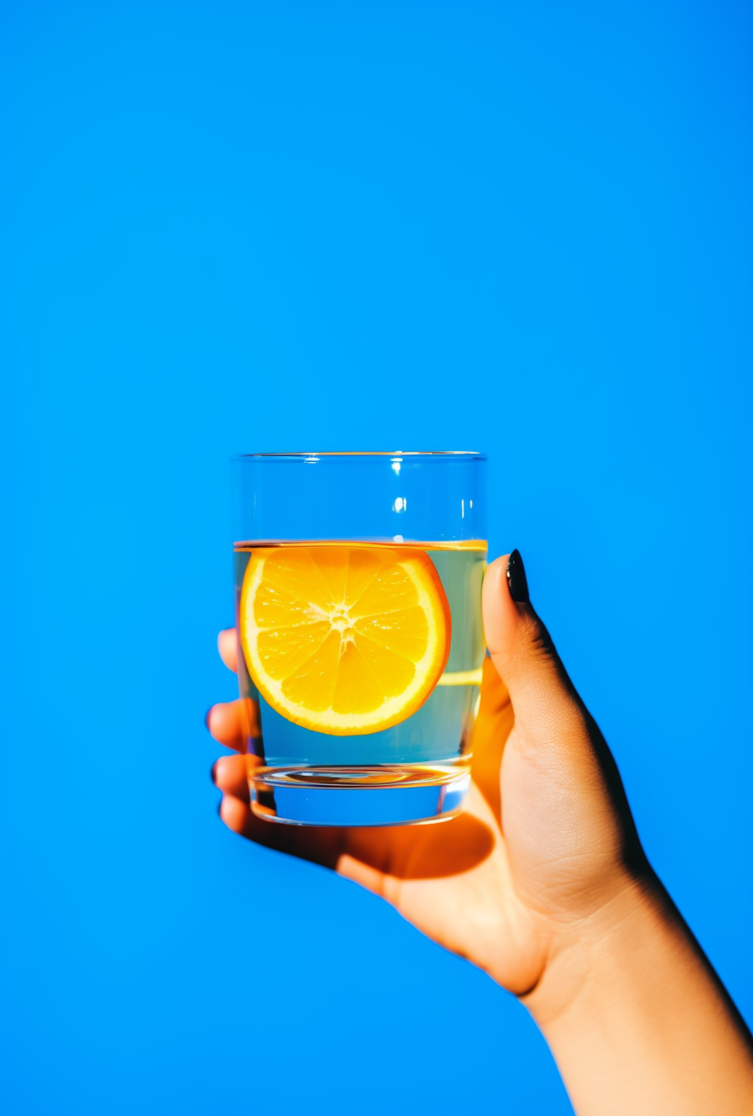 Hand holding a glass of water with an orange slice against a bright blue background. Vibrant and refreshing composition.