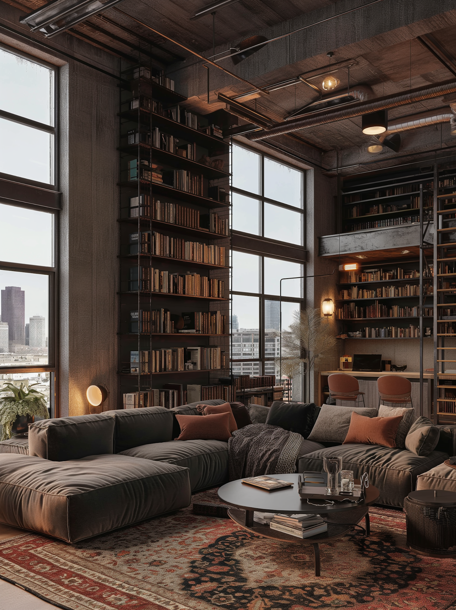 Modern loft with large windows, cozy library, plush sofa, and industrial ceiling. Perfect blend of comfort and style.