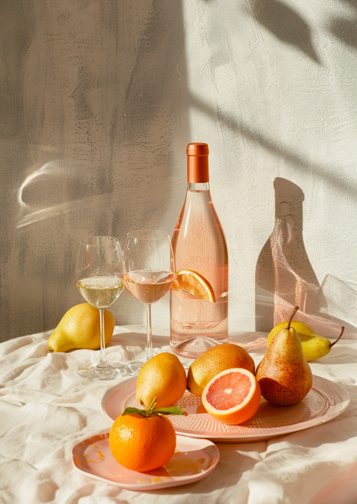 Elegant still-life with rosé wine, fresh fruits, and soft lighting on a textured backdrop, evoking a warm and inviting atmosphere.