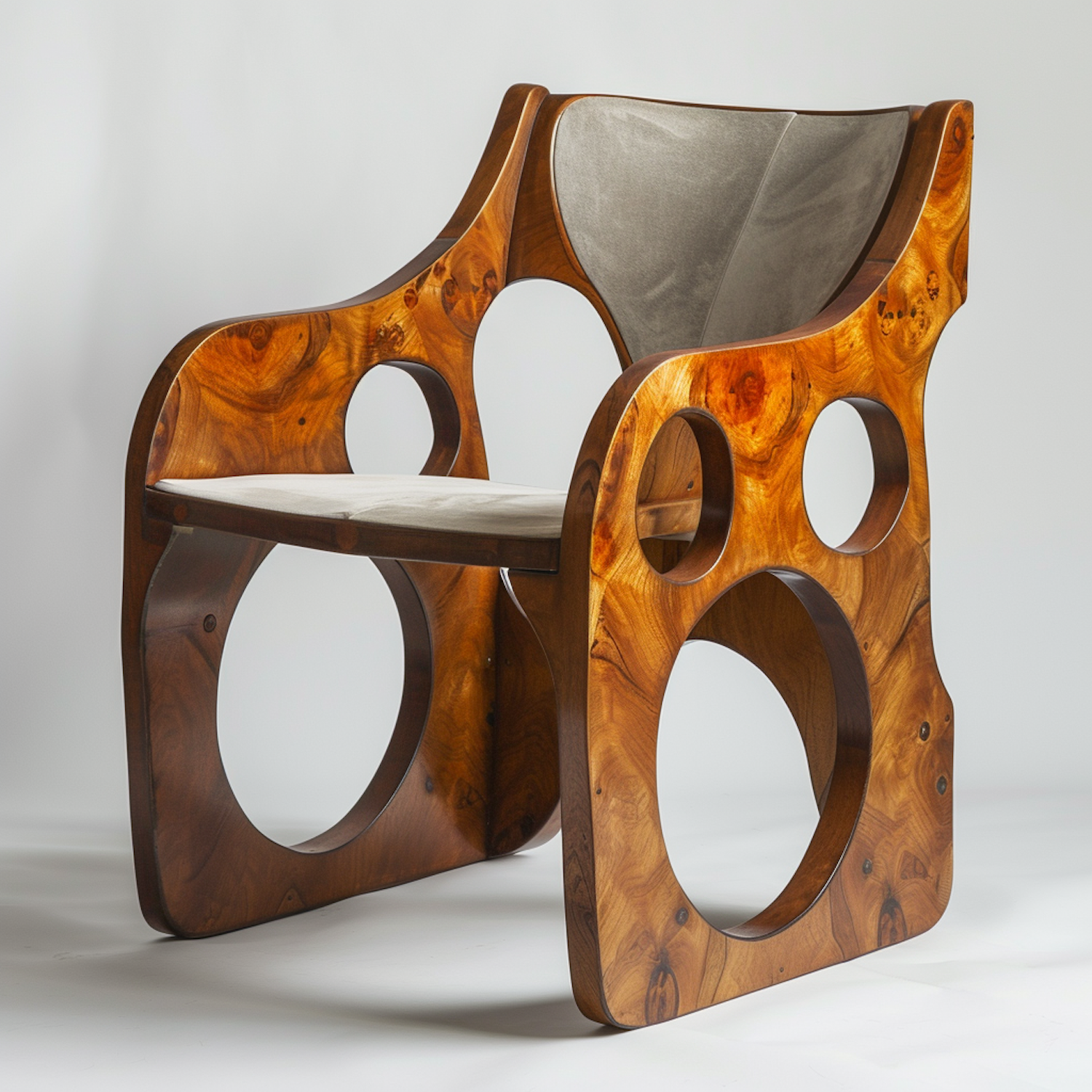 Modern chair with wooden frame and circular cutouts, upholstered in light gray fabric. Unique design with rich wood grain patterns.