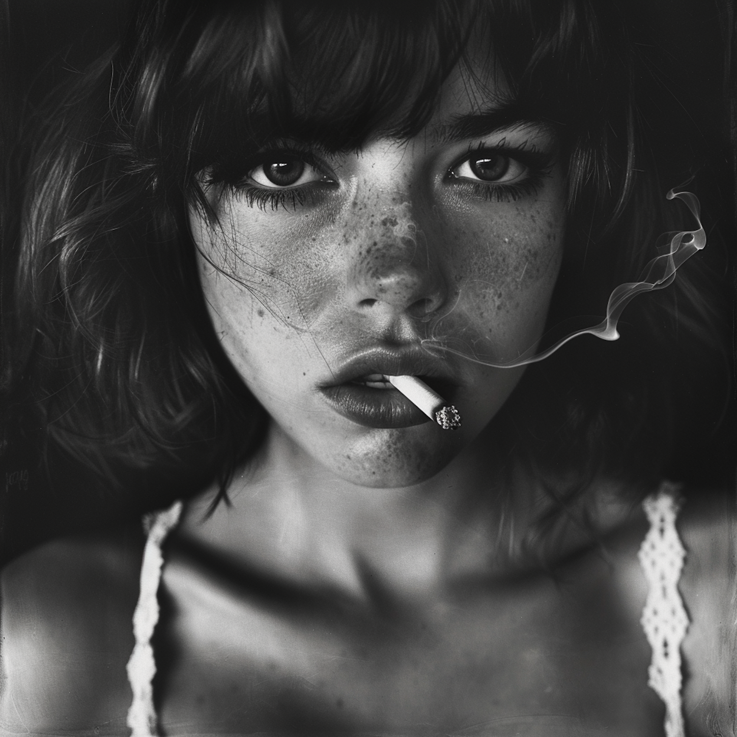 Black and white portrait of a freckled woman with a cigarette, intense gaze, and lace top, creating a dramatic and moody atmosphere.