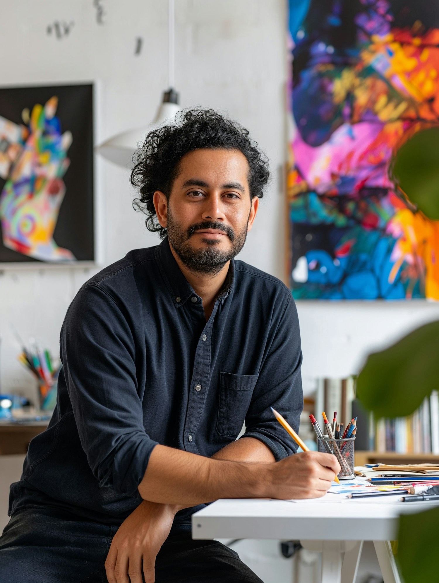 Artist in a studio with vibrant abstract paintings, holding a pencil at a white desk. Creative workspace with colorful art supplies.