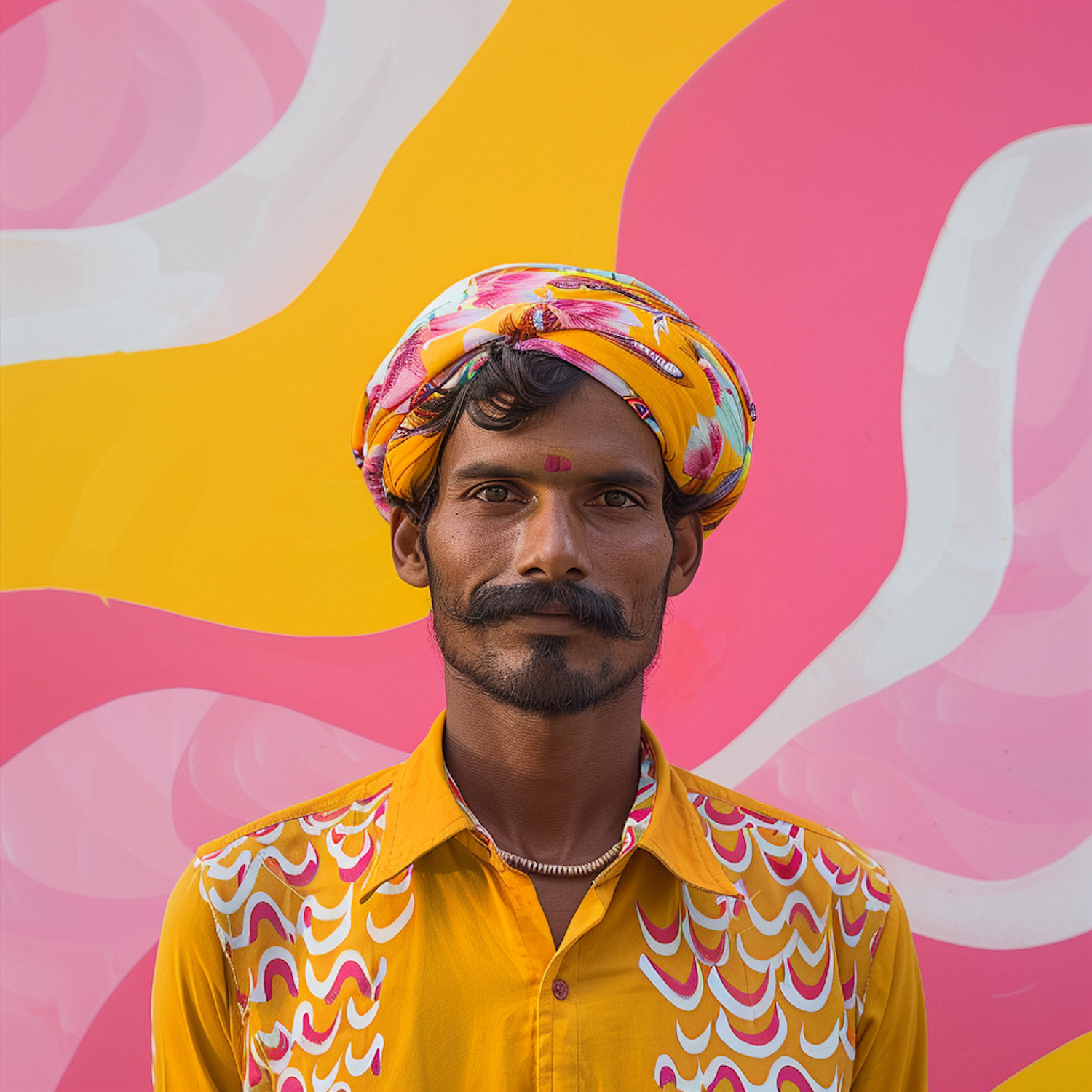 Man in colorful turban and shirt against vibrant pink and yellow swirled background.
