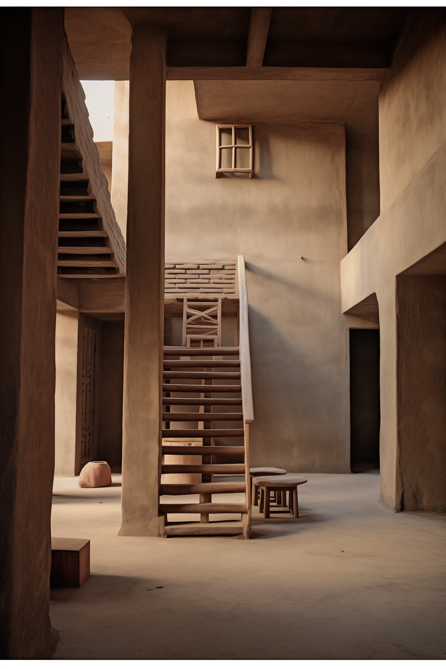 Minimalist interior with wooden staircase, earthy tones, and natural light. Rustic charm with clay-like walls and wooden furniture.