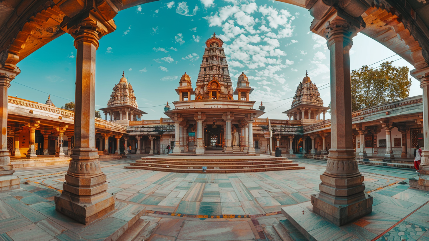 Majestic temple courtyard with intricate carvings, columns, and arches under a clear blue sky. Warm sunlight enhances the serene atmosphere.