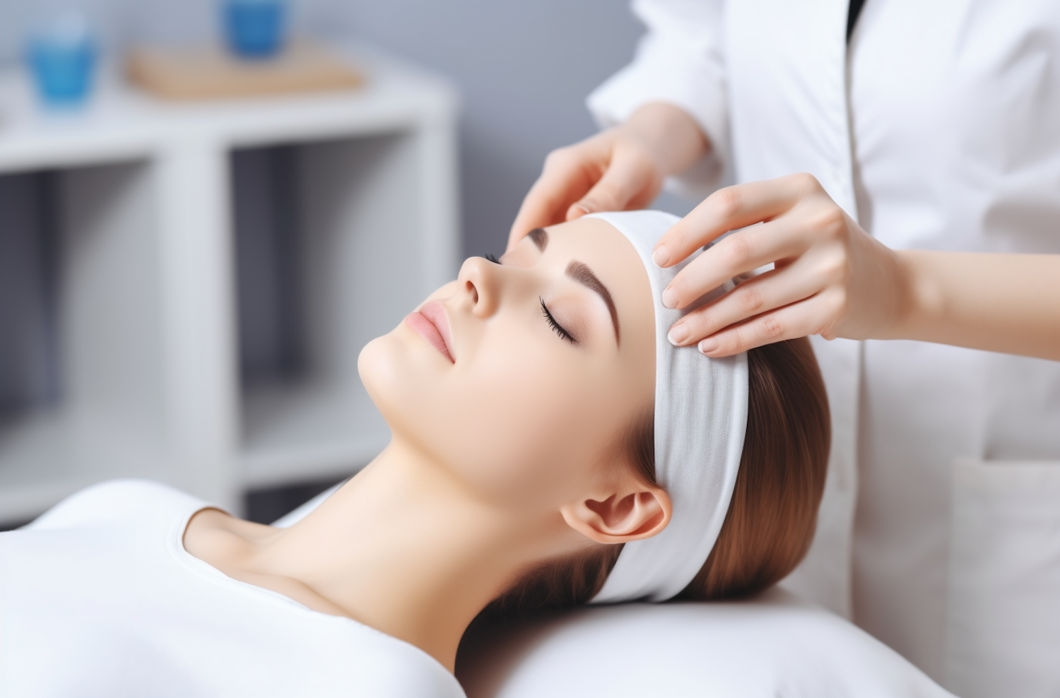 A woman with fair skin enjoys a relaxing facial treatment in a spa, with a professional gently massaging her forehead.