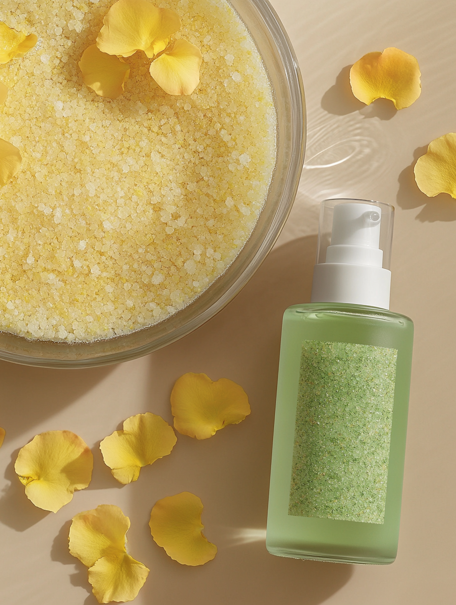Spa essentials with yellow bath salts and a green scrub bottle, surrounded by yellow rose petals on a beige background.