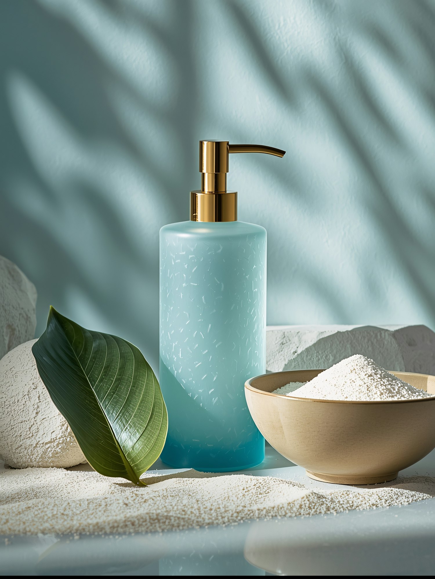 Elegant light blue bottle with golden pump, surrounded by natural elements like a green leaf and white powder in a wooden bowl.