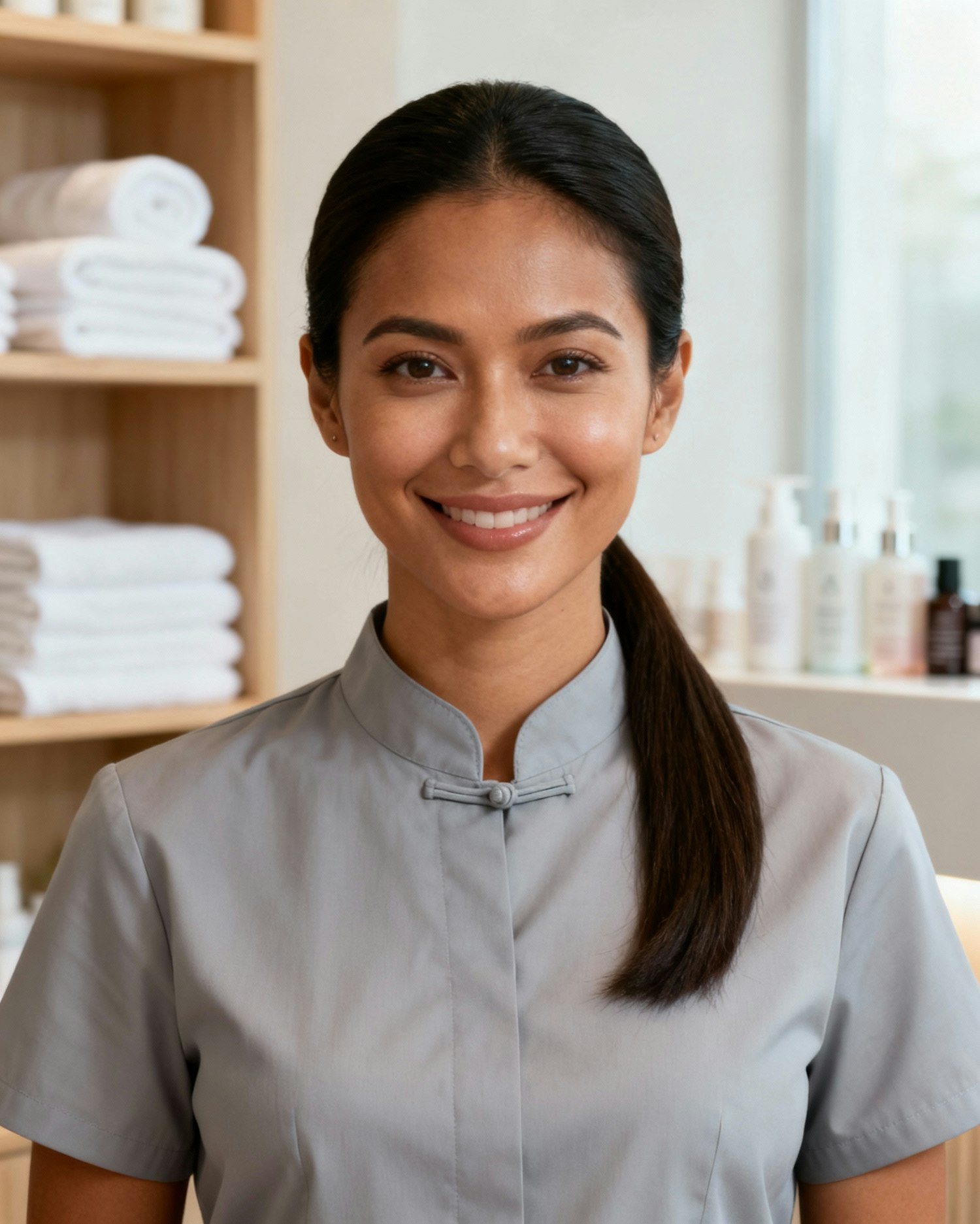 A professional woman in a spa setting, wearing a gray uniform, with shelves of towels and skincare products in the background.