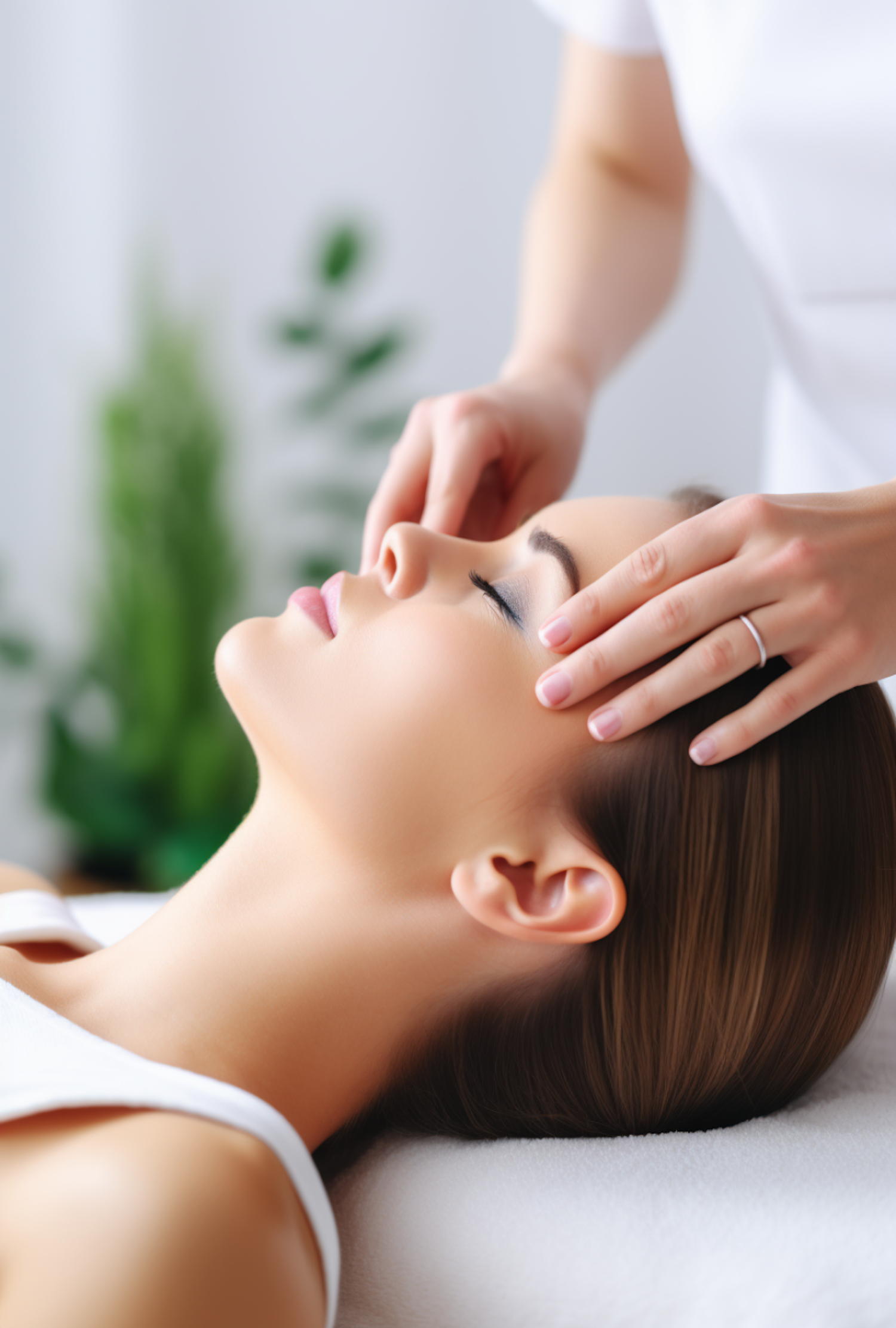 Woman receiving a relaxing facial massage in a serene spa setting, with gentle hands pressing on her temples.