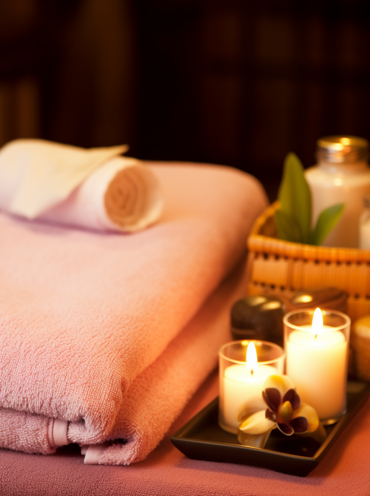 Serene spa scene with pink towels, lit candles, and an orchid flower, creating a calming and inviting atmosphere.