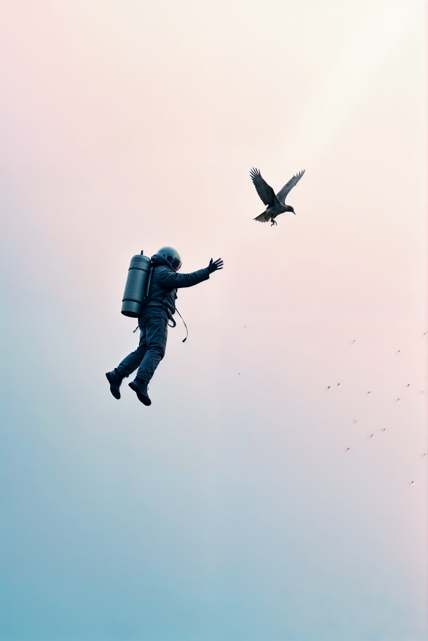 A person in a space suit floats in the sky, reaching for a bird against a pastel gradient background.