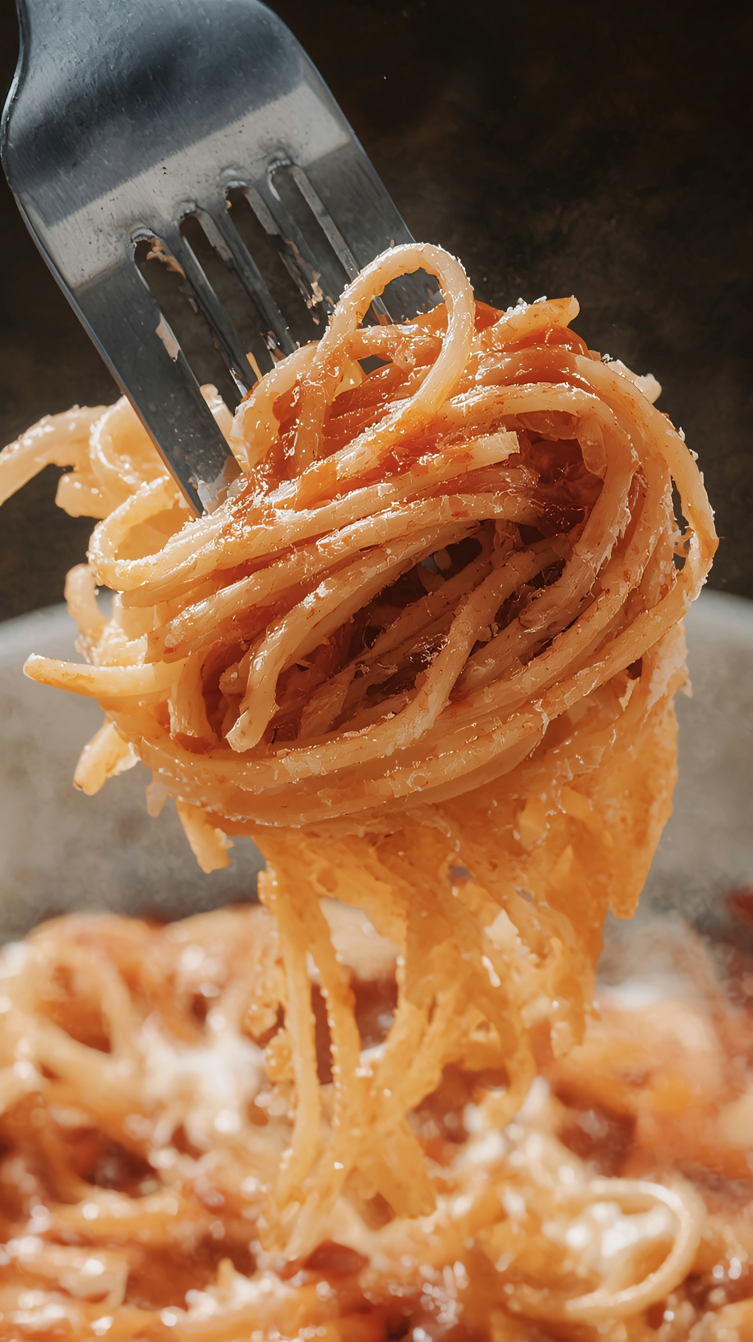 Close-up of a fork twirling spaghetti with tomato sauce and grated cheese, highlighting the texture and rich colors of the dish.