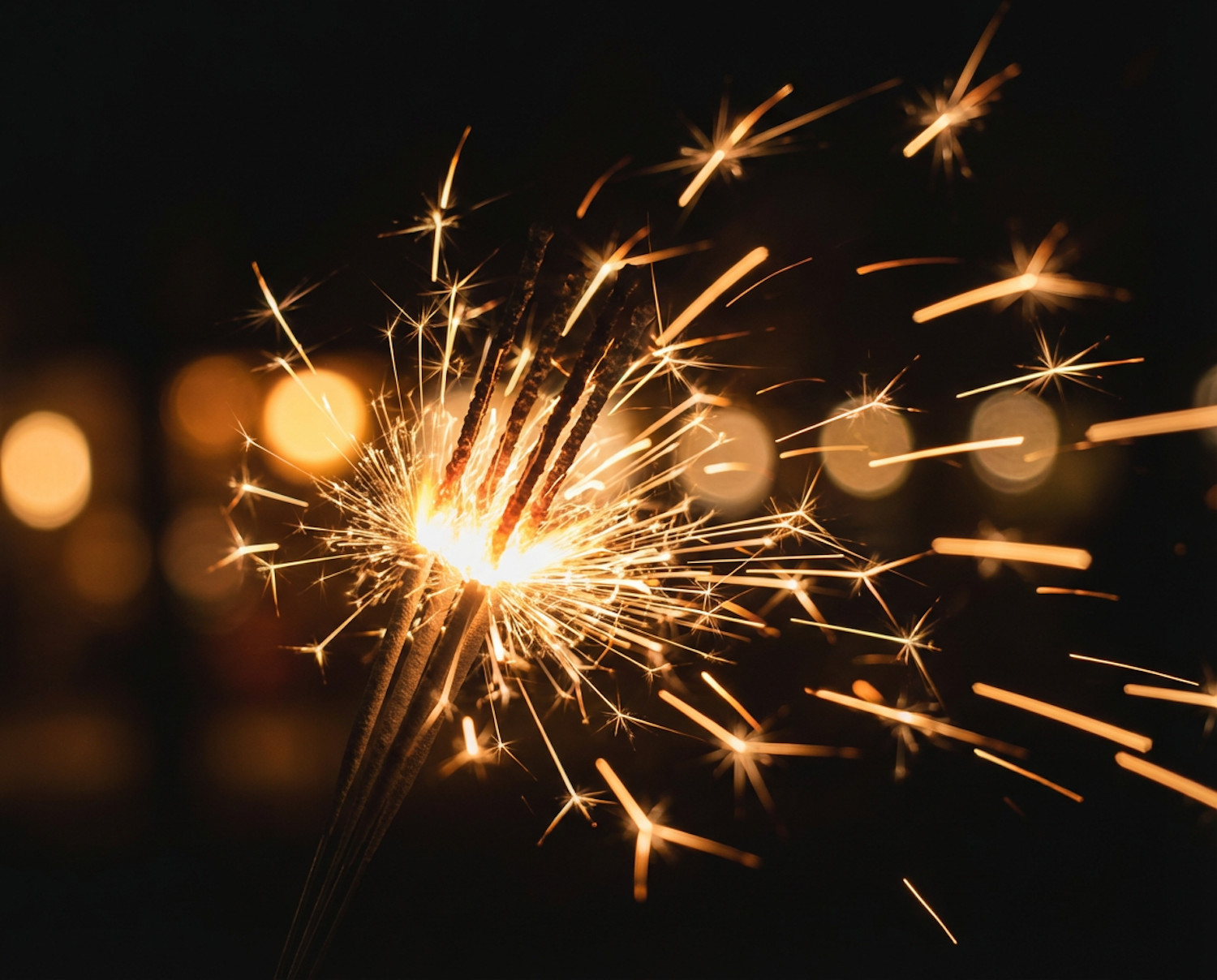 A close-up of a lit sparkler with golden sparks radiating against a dark background, creating a festive and dynamic visual effect.