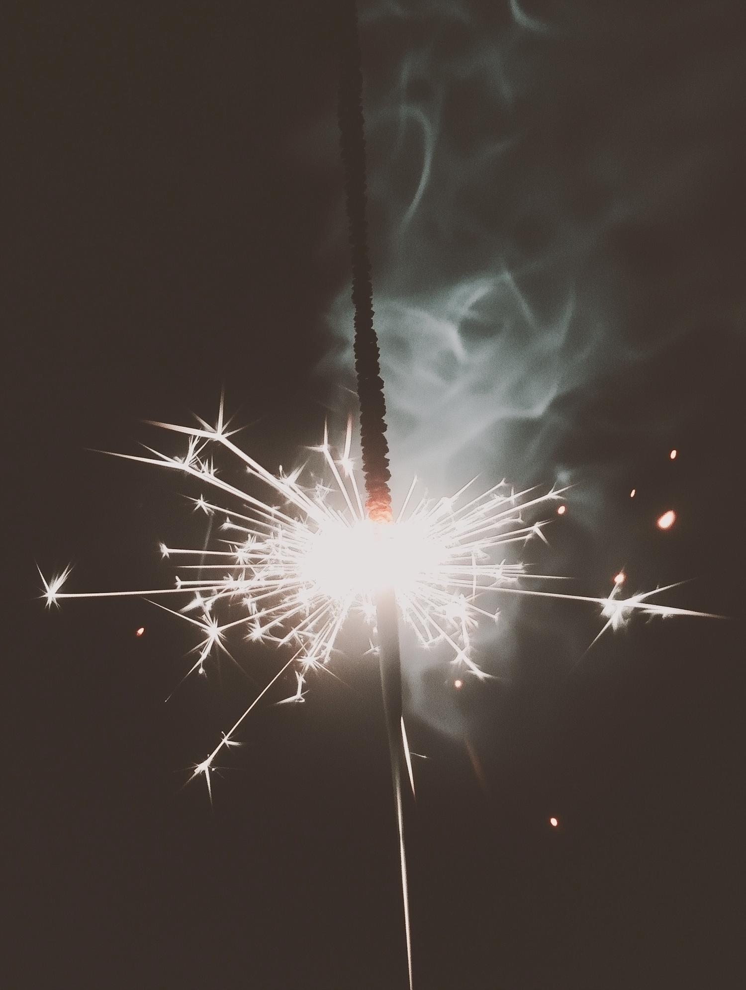 A bright sparkler emits dazzling sparks against a dark background, creating a festive and dynamic visual display.