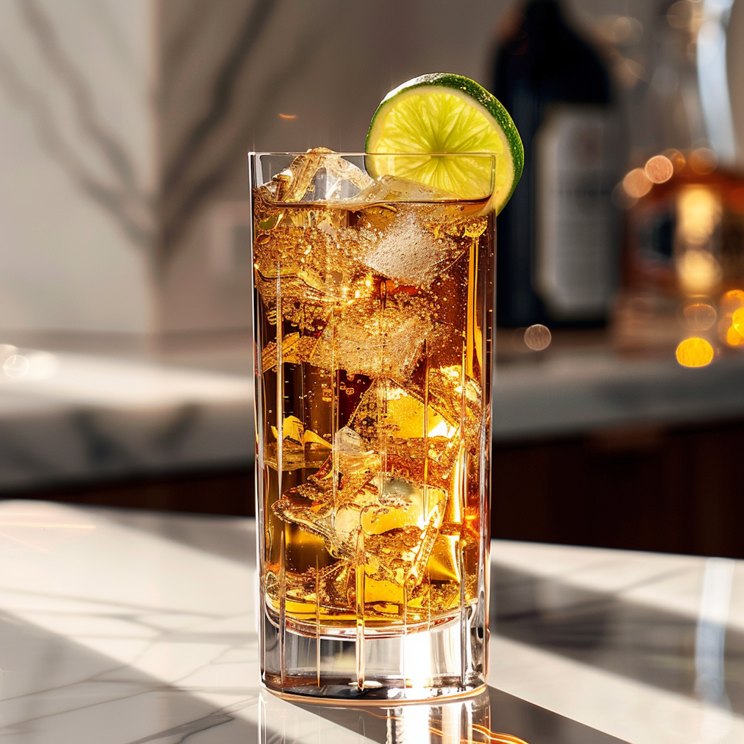 Refreshing cocktail with lime garnish and ice cubes in a tall glass on a marble surface, set against a warm, blurred background.
