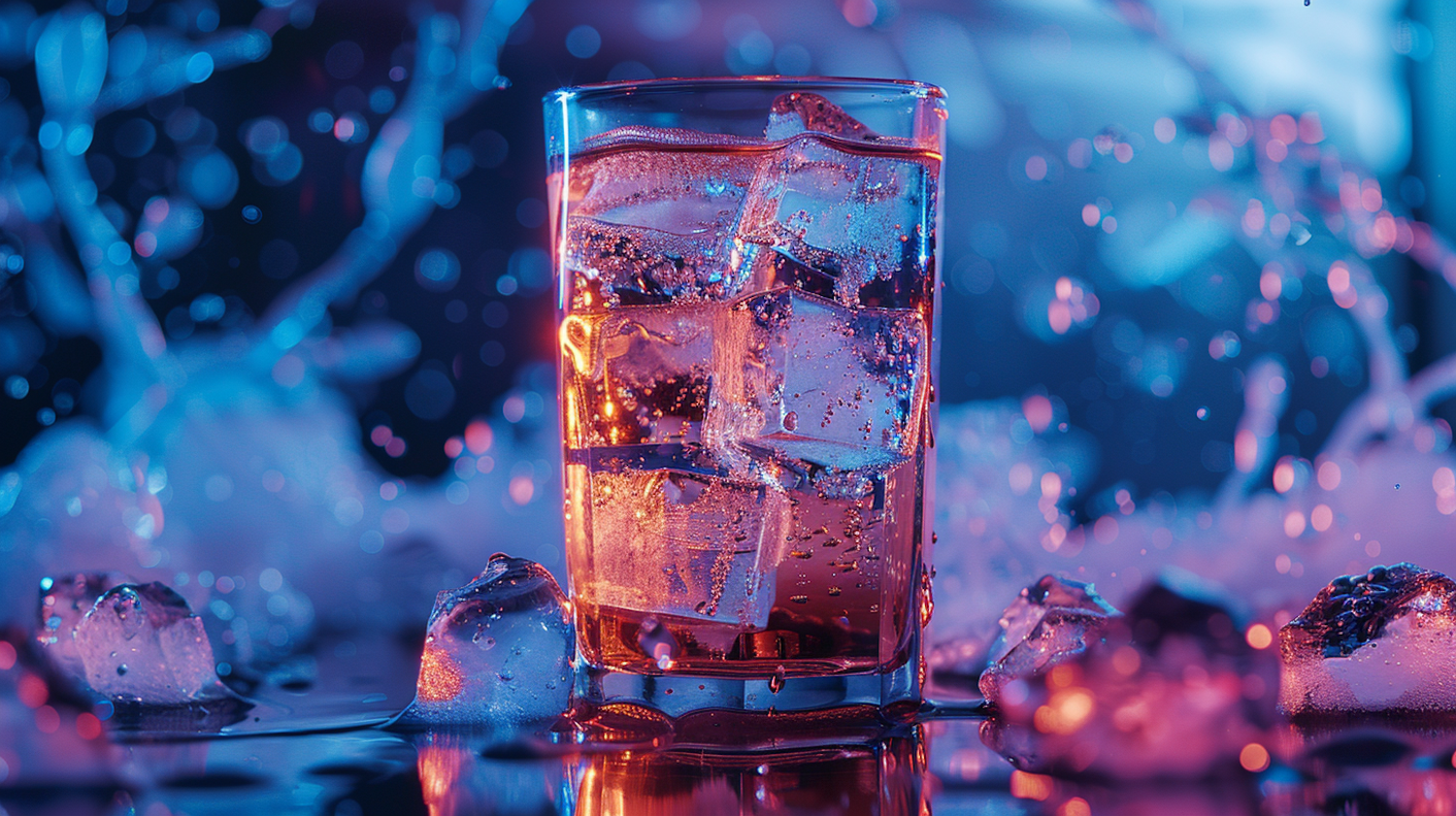 Vibrant glass of fizzy drink with ice cubes, illuminated by blue and pink lights, creating a refreshing and dynamic scene.
