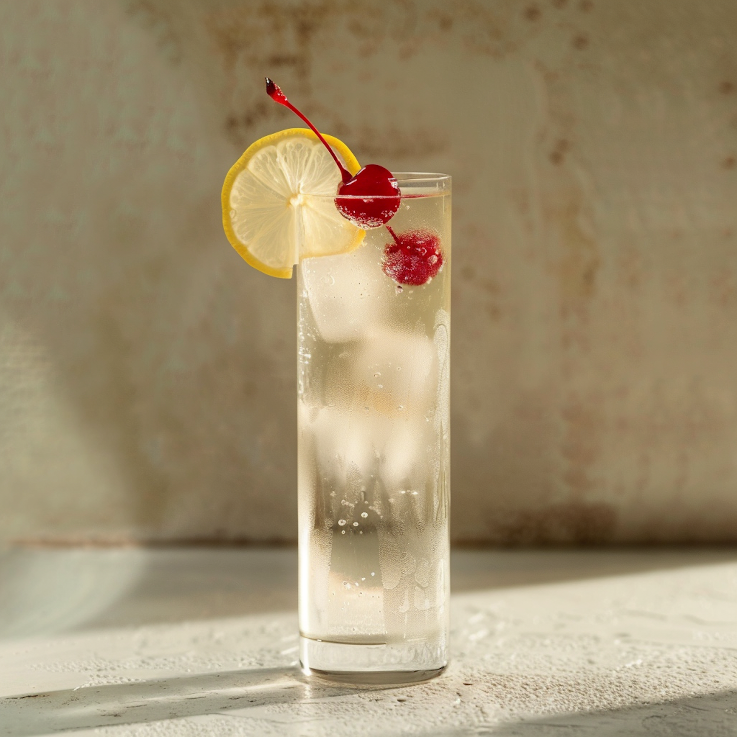 Refreshing cocktail with lemon and cherry garnish in a tall glass, set against a warm, neutral background.