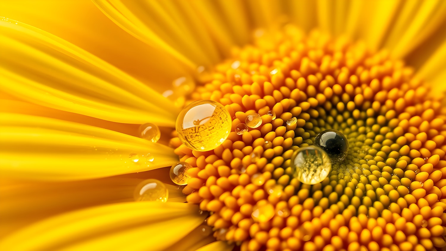 Close-up of a vibrant yellow flower with water droplets on its petals and central disc, showcasing intricate details and natural beauty.